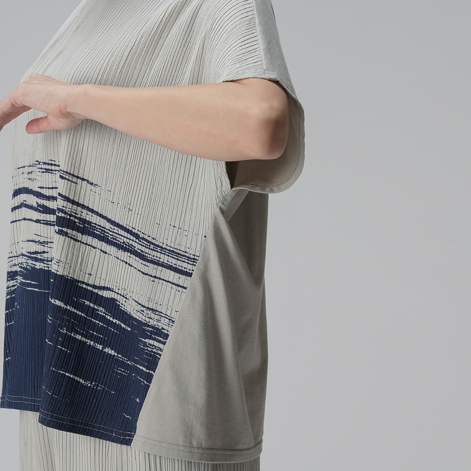 横方向のストレッチ性に富んだプリーツ生地に、日本海の波をイメージしたプリントをほどこしました。生地裏には横方向にポリウレタン糸を走らせて、安定性も良好に。凹凸の多い生地にプリントするという難易度の高い仕事に、京都の老舗染工所の技が光っています。