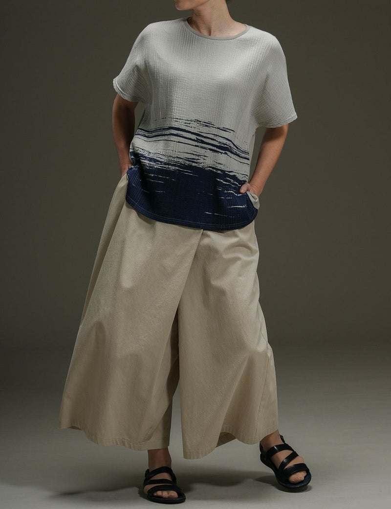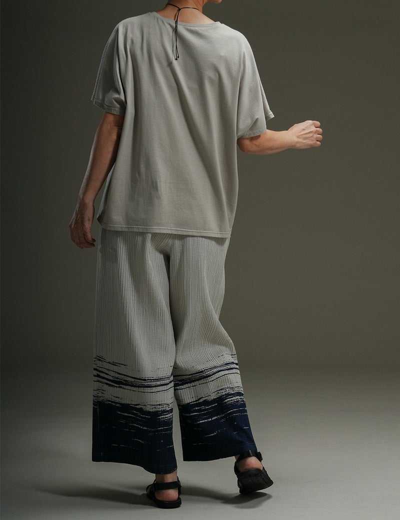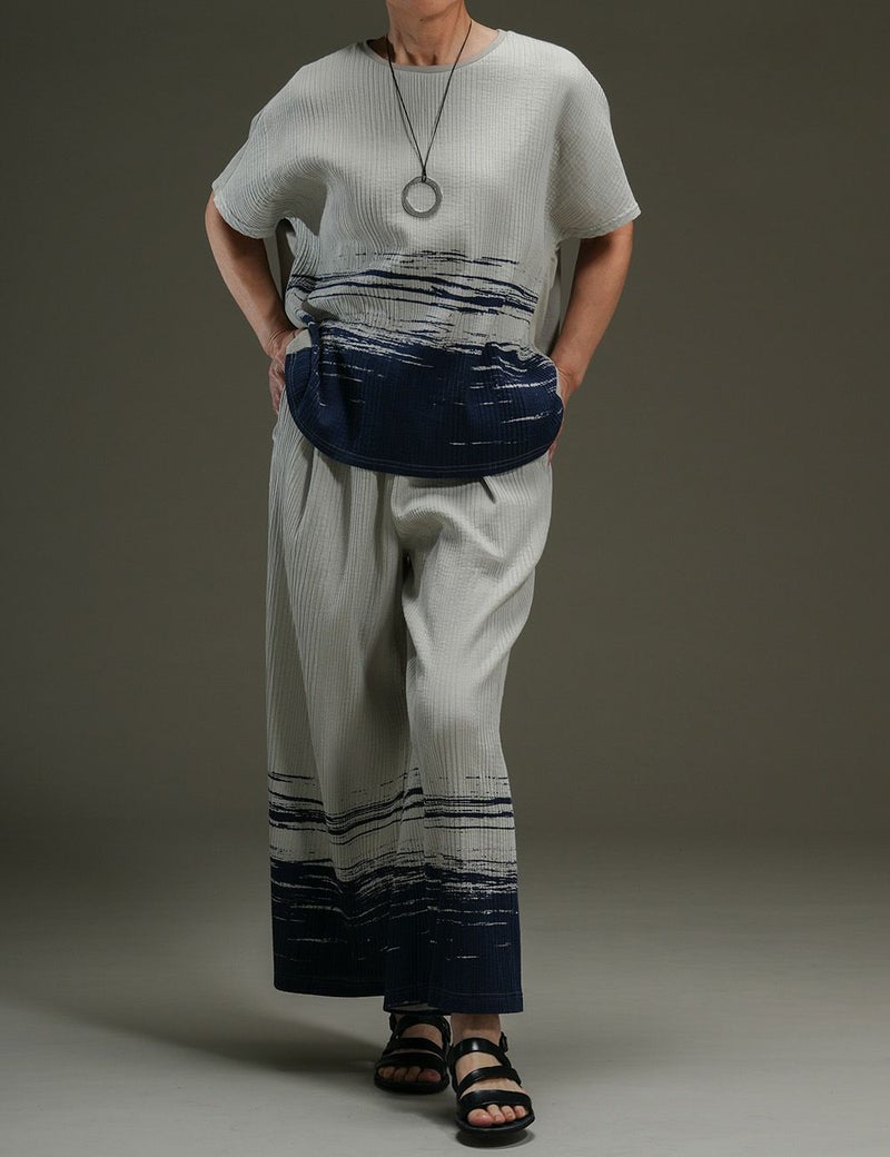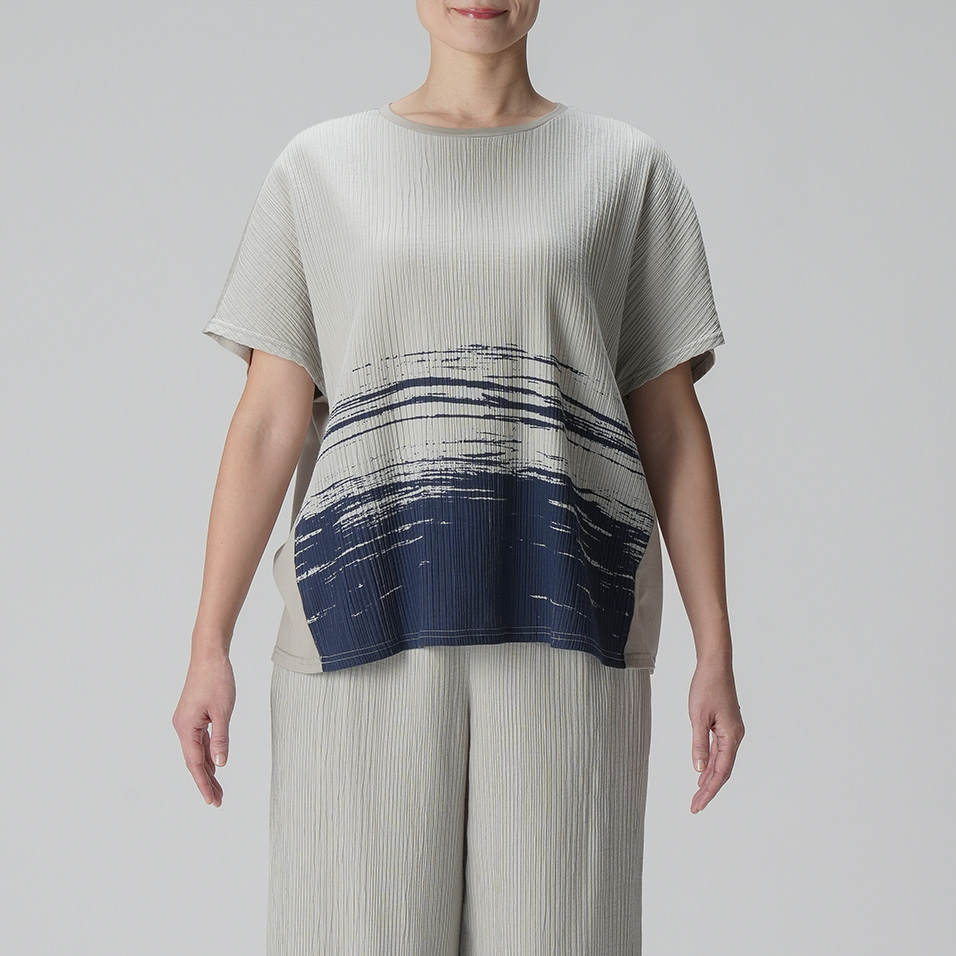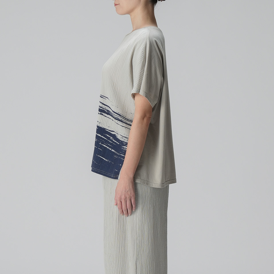 前身頃には波のモチーフが踊るプリーツ生地、後ろ身頃には天竺のカットソー生地をあしらった個性派トップス。単調になりがちな春夏のコーディネートも、これ一枚で一気に垢抜けます。共生地のパンツとのセットアップもおすすめです。