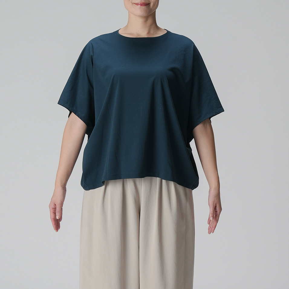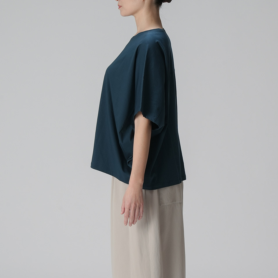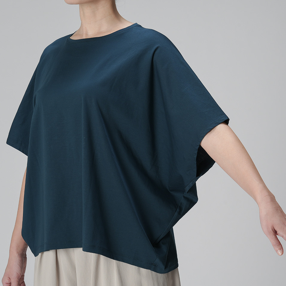 なめらかで艶やかなスーピマコットンを使用した、モモンガ風シルエットのカットソー。肌をすべるような極上の心地よさが味わえます。からだの動きに合わせて揺れるドレープも美しく、一枚さらりとまとうだけで絵になります。