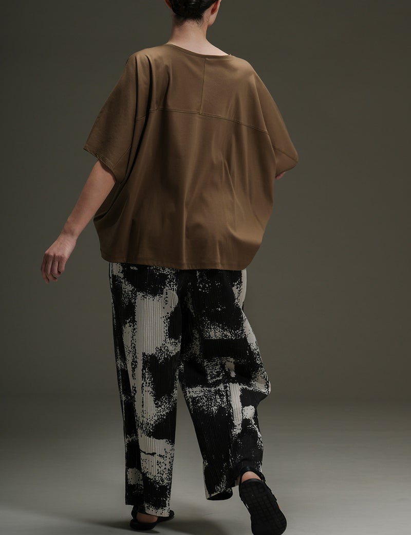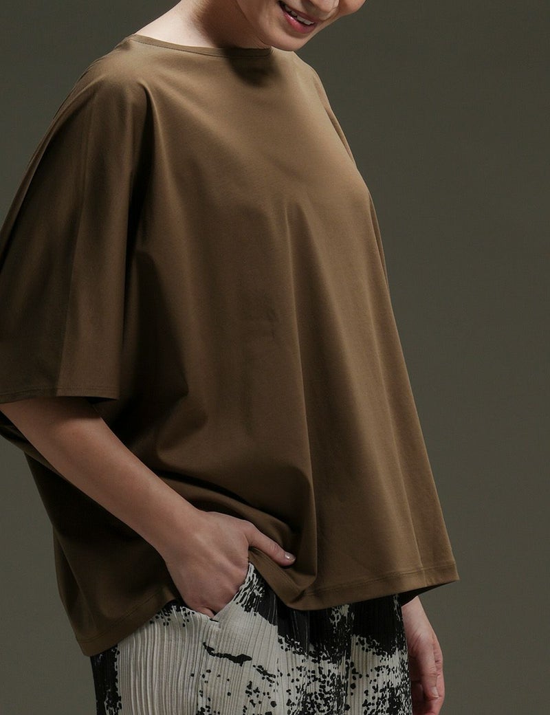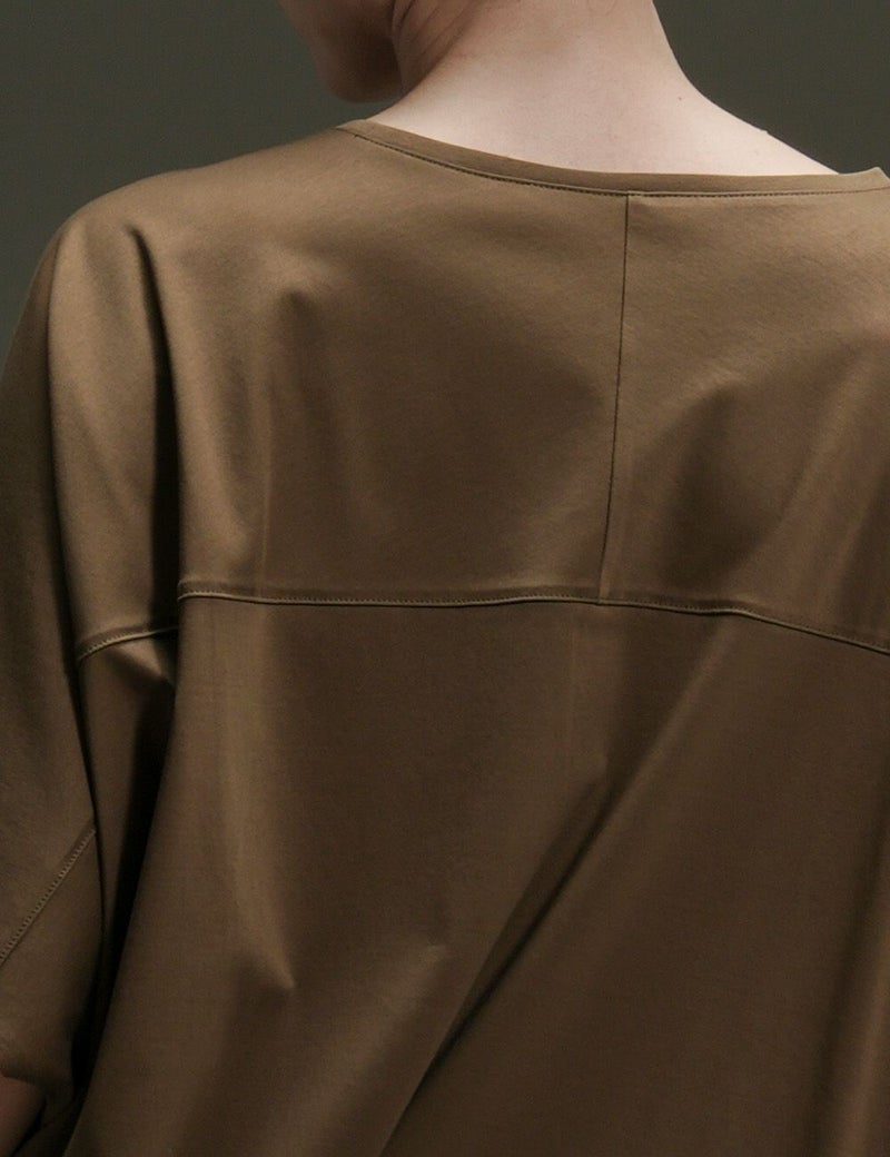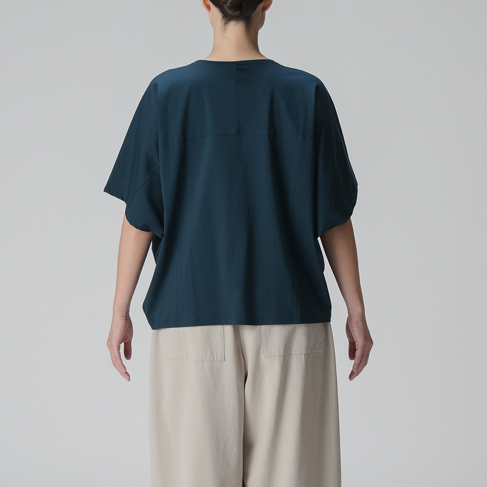 なめらかで艶やかなスーピマコットンを使用した、モモンガ風シルエットのカットソー。肌をすべるような極上の心地よさが味わえます。からだの動きに合わせて揺れるドレープも美しく、一枚さらりとまとうだけで絵になります。