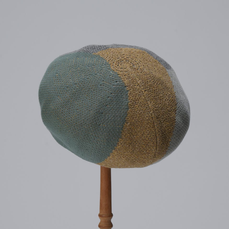綿とシルクとポリエステルの混紡糸で編み上げた、ほんのり艶めくベレー。大胆に色分けされたデザインながら、シックな色使いの効果で、コーディネートに違和感なく溶け込んでくれます。360°どこから見てもチャーミングなスタイリングをお楽しみください。