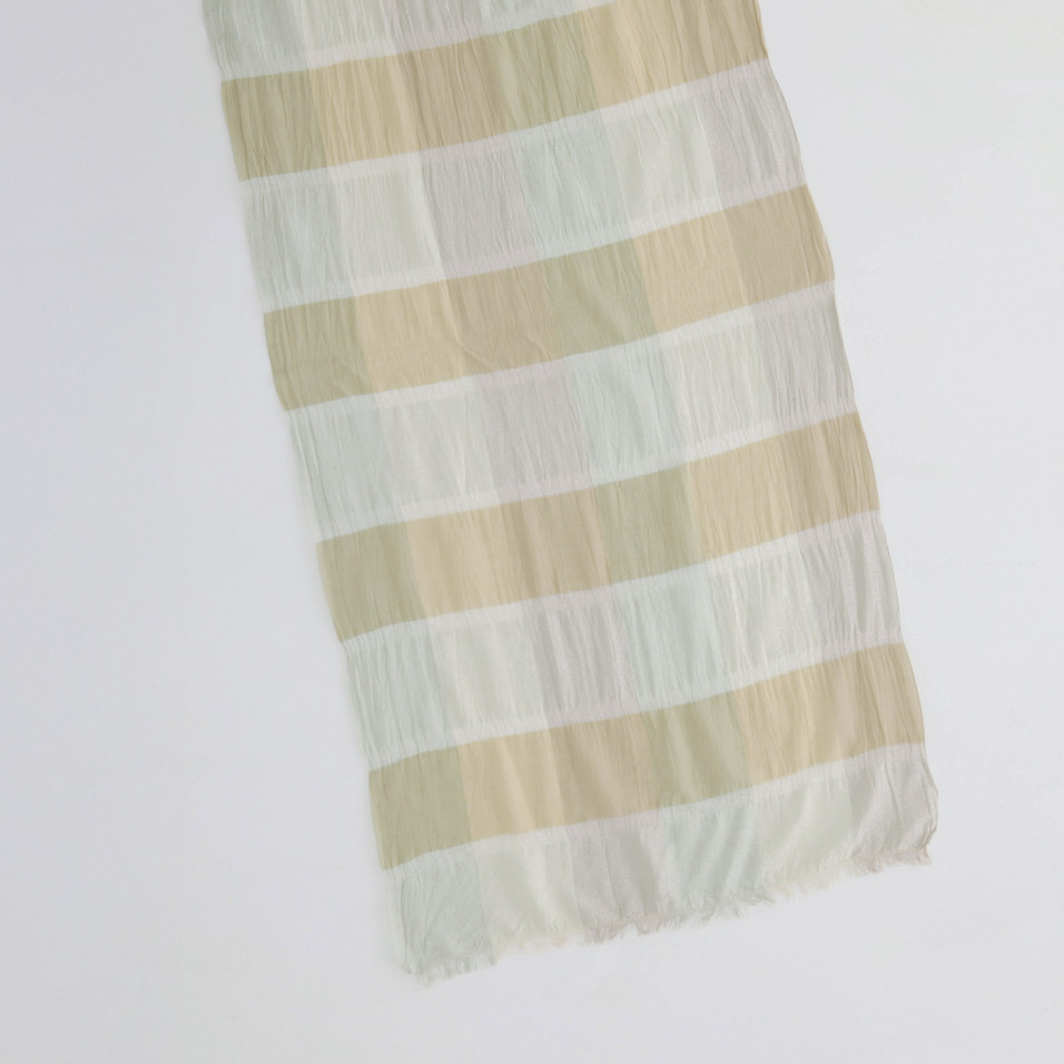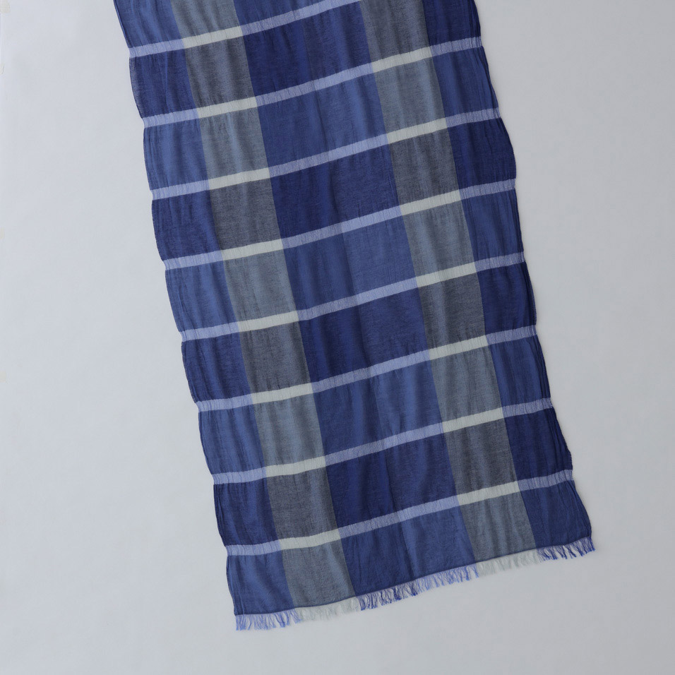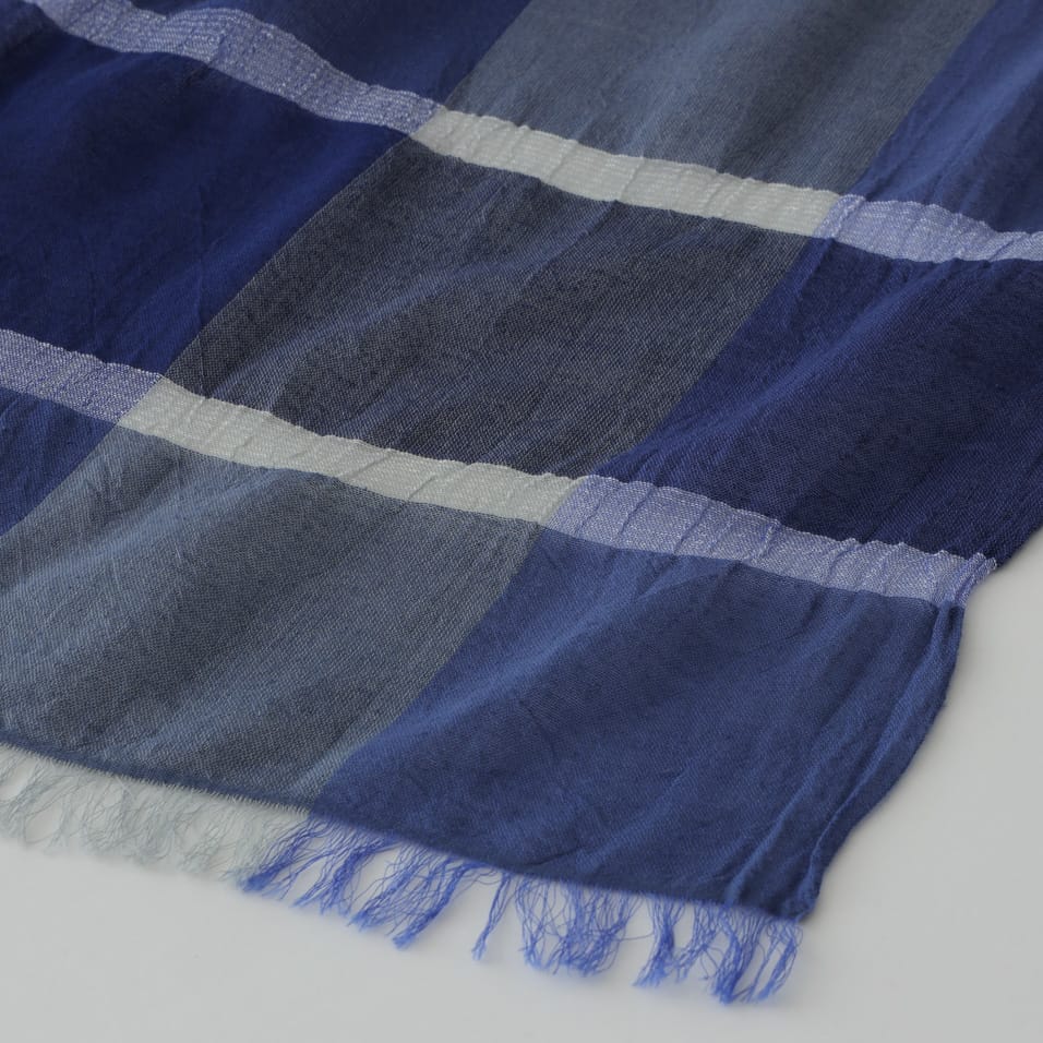 シルクのなめらかさと艶やかさに、綿と麻の自然な風合いをブレンドした薄手ストール。ブロックチェックに織り込まれた綿強撚糸の白ラインが縮絨(しゅくじゅう)し、生地表面に波打つような表情を与えています。無造作に巻くだけで美しく映える一枚です。