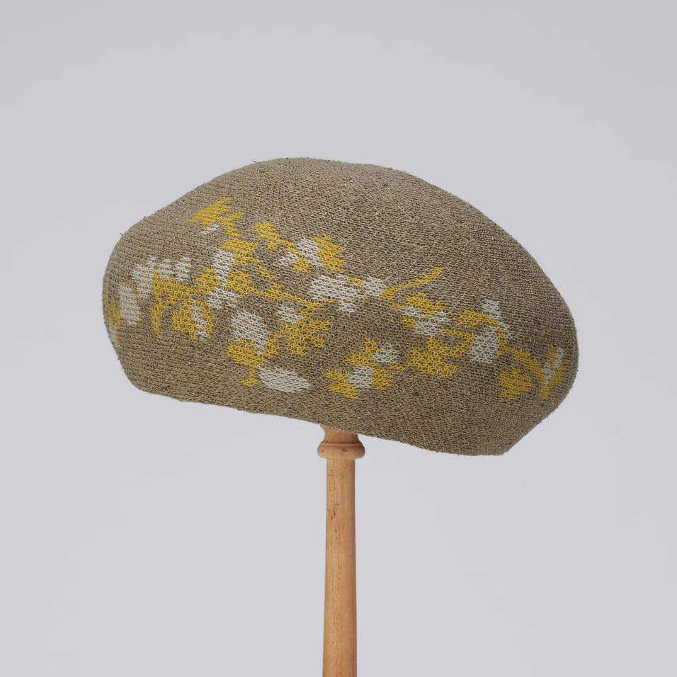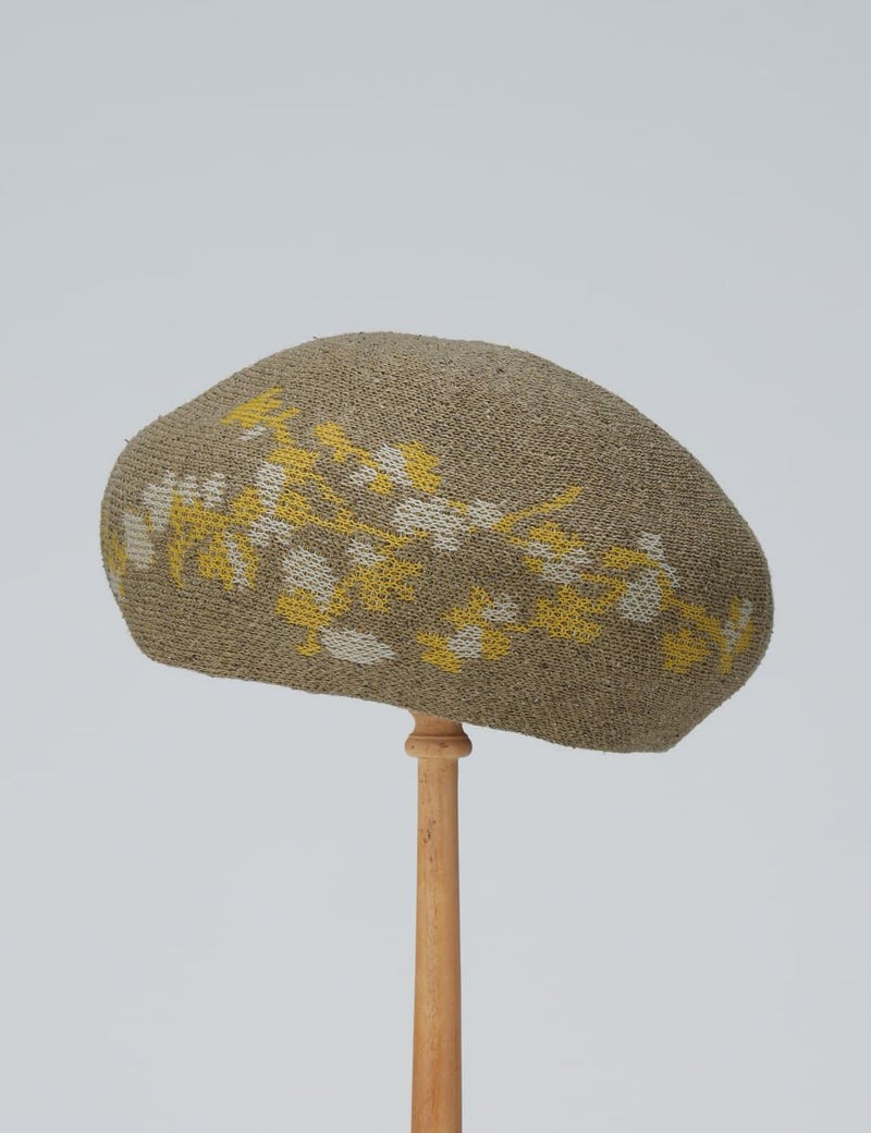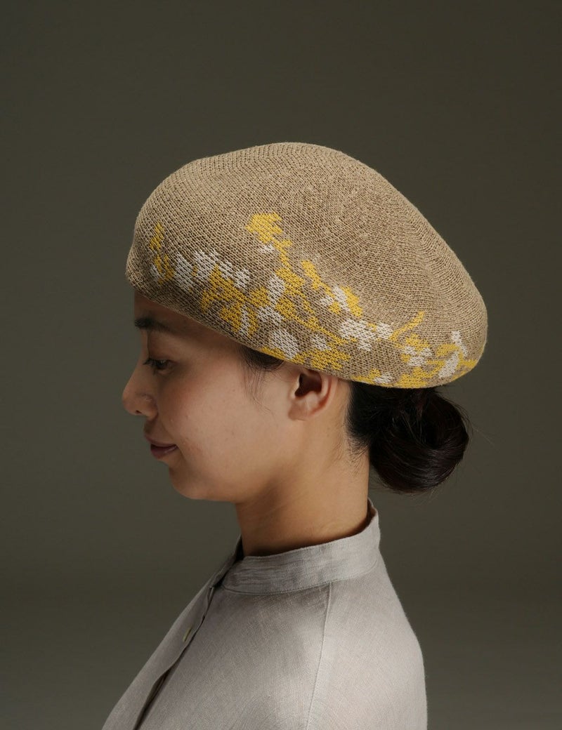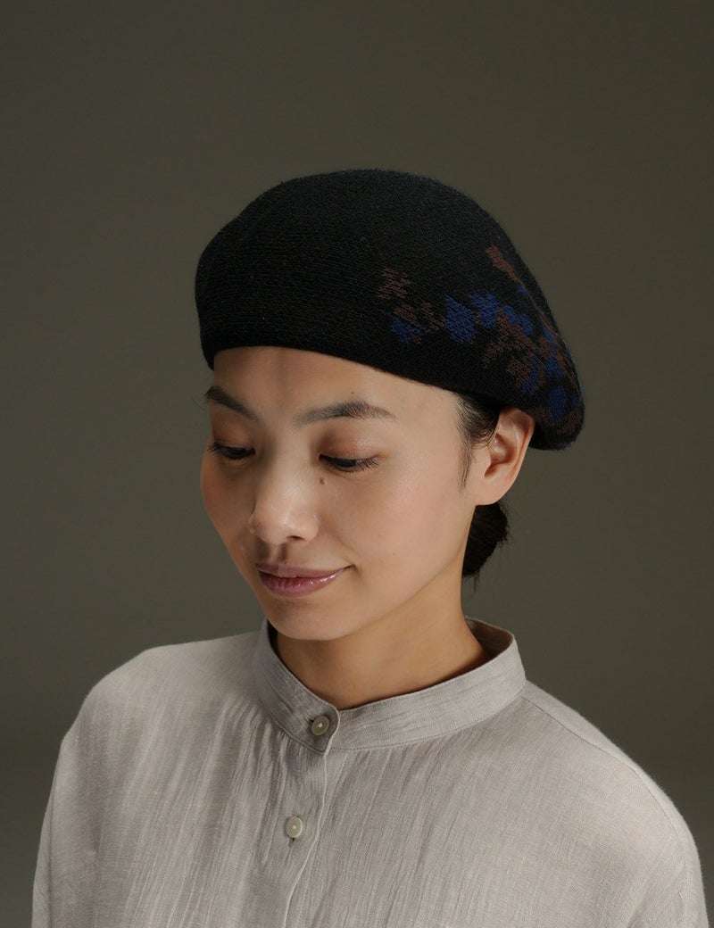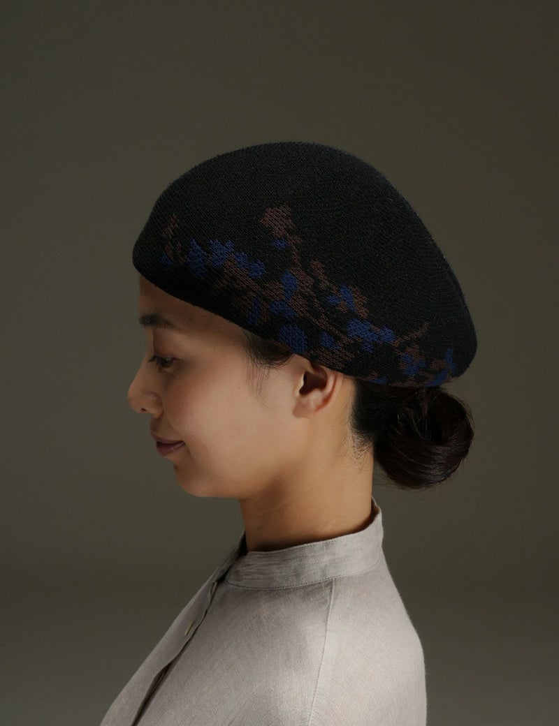 シルクを贅沢に使用した、きれいめ質感のベレー。枝に咲く花々のモチーフを編み込んで、全身コーディネートにやさしい華を添えます。ほどよい肉厚感があり、美しいフォルムを保ってくれるのもポイント。