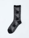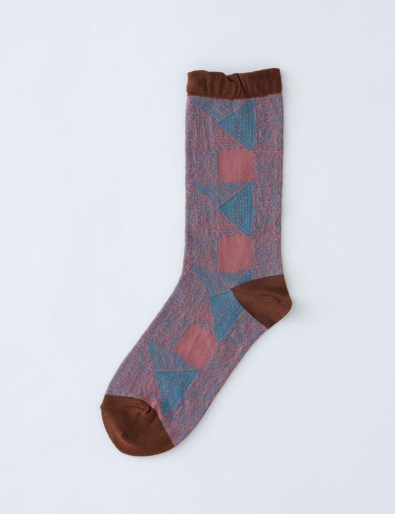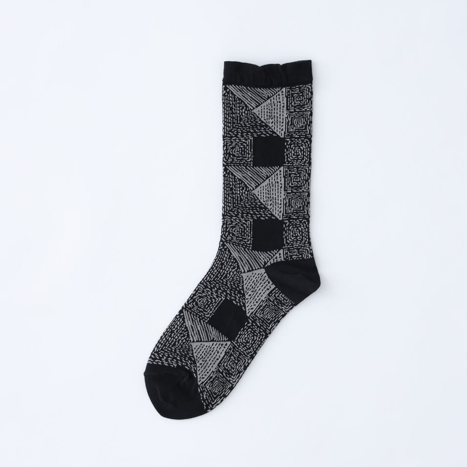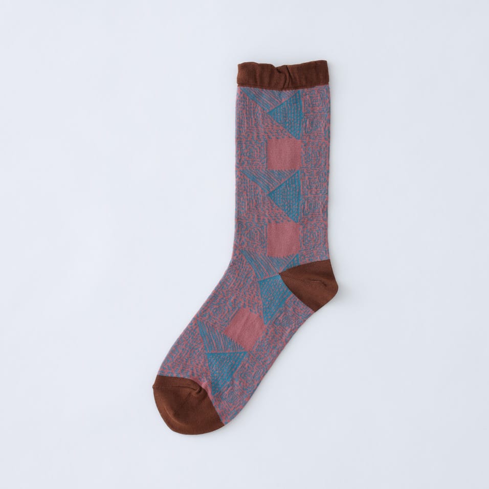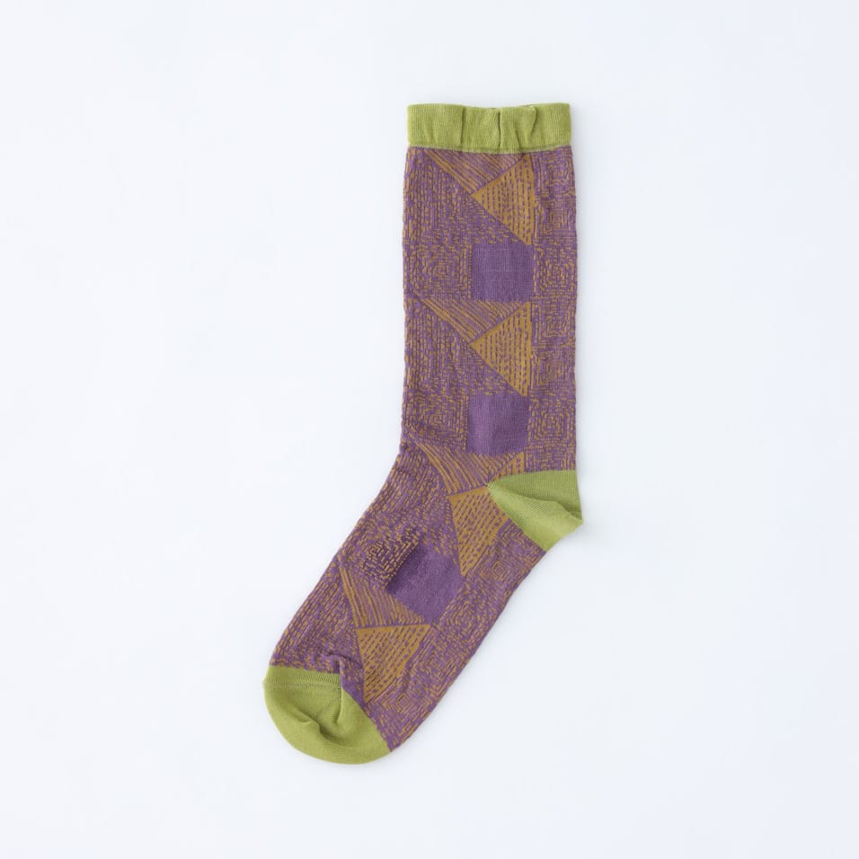 手刺しのステッチキルトを思わせるモチーフを、繊細な編み地で表現したソックス。やわらかな履き口のリブがもたらす、やさしいフィット感がクセになります。ちょっぴりひねりの効いた配色も、着こなしのスパイスになってくれそう。