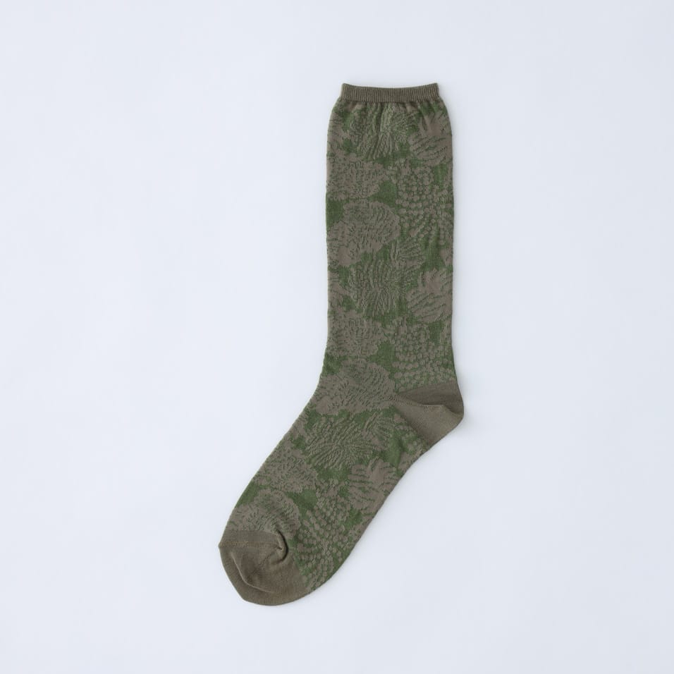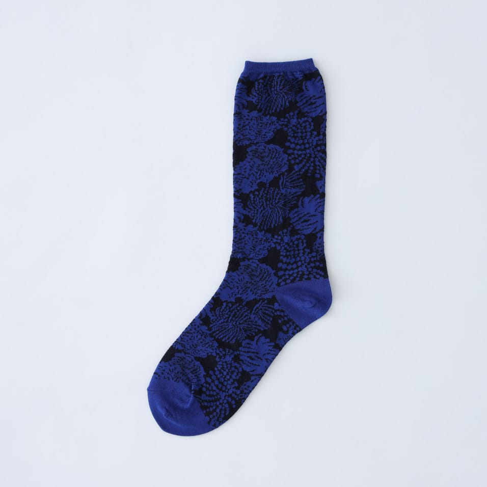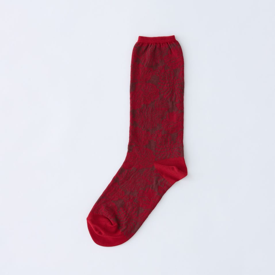 糸玉を思わせるモチーフを、繊細な編み地で表現したソックス。コーディネートに合わせて足元の差し色をお楽しみください。