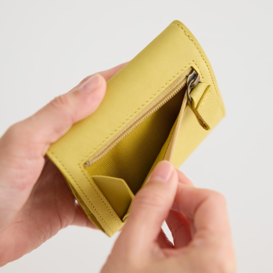 【 B.stuff×群言堂 】しなやかに手になじむ上質レザーを生かしたコンパクトな三つ折り財布。丸みを帯びたフラップで、開閉しやすさと可愛らしさを叶えました。小さなバッグで身軽にお出かけしたい時にぴったりです。