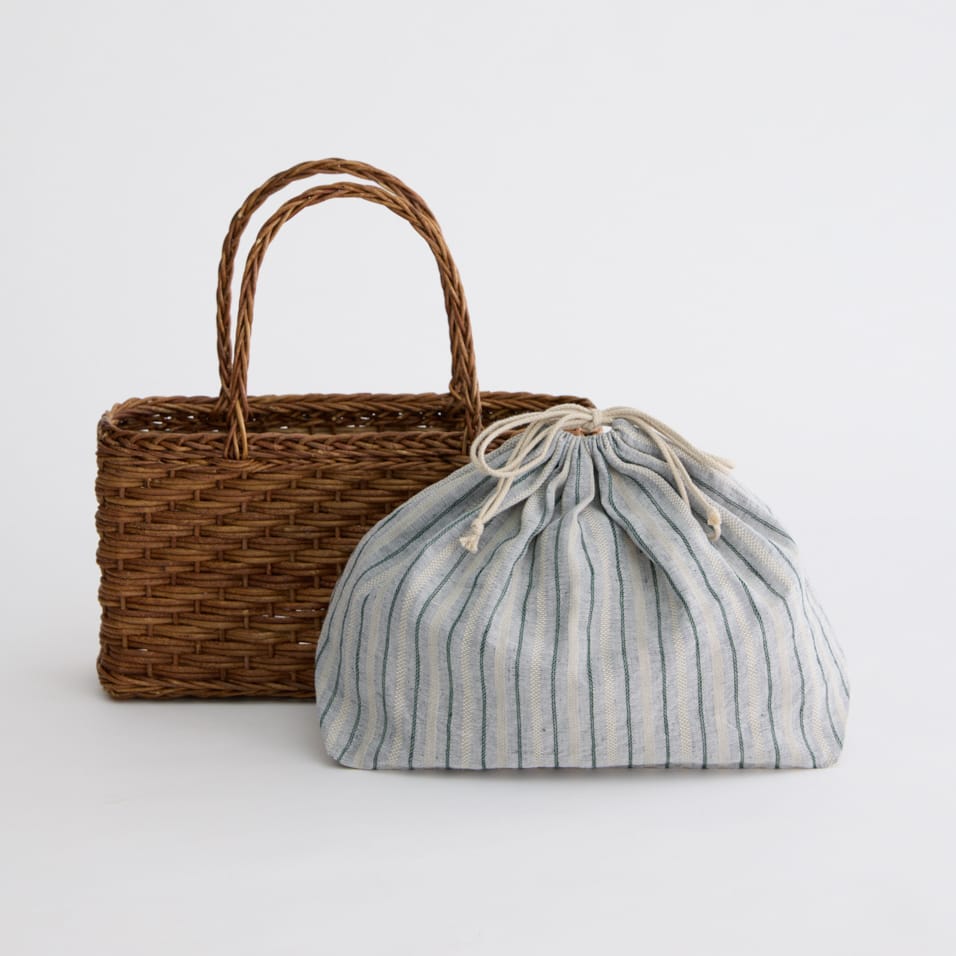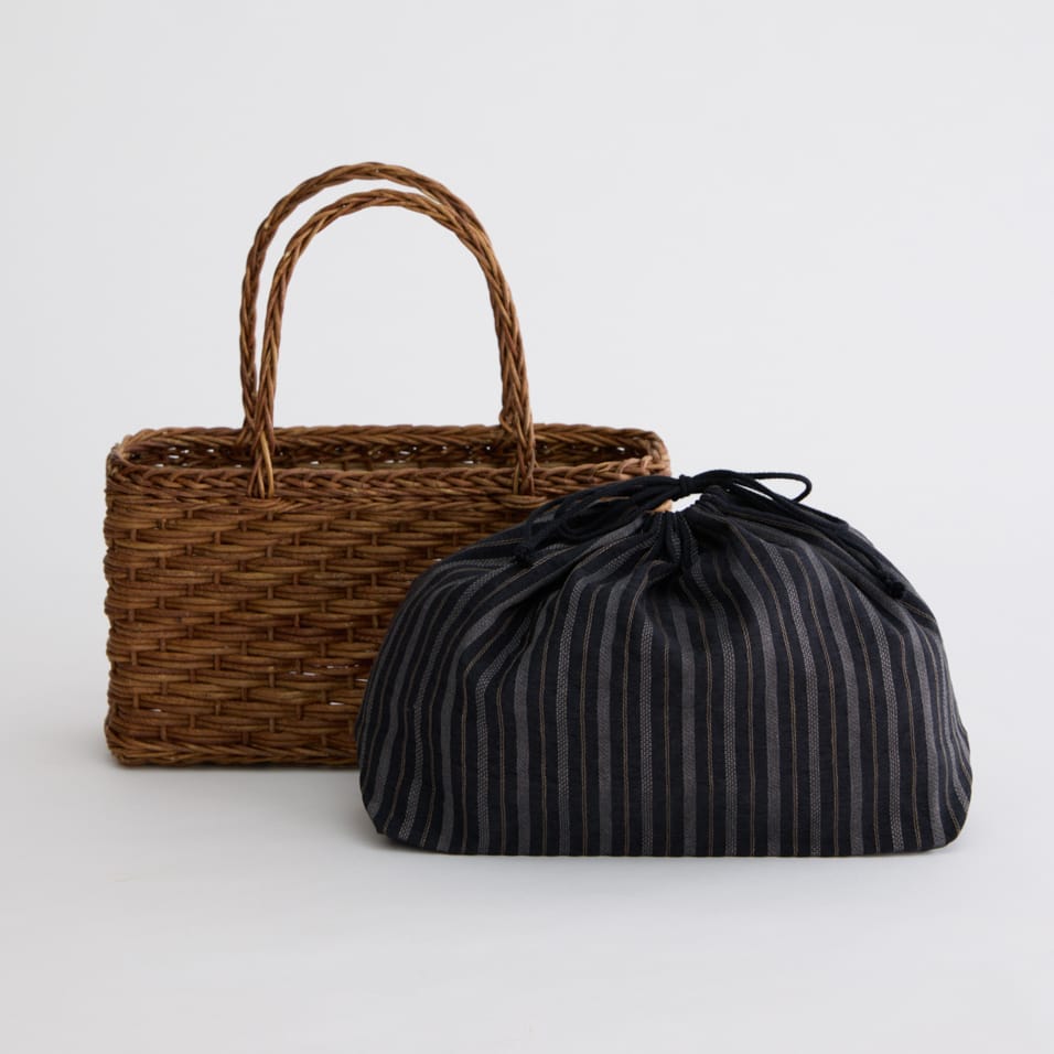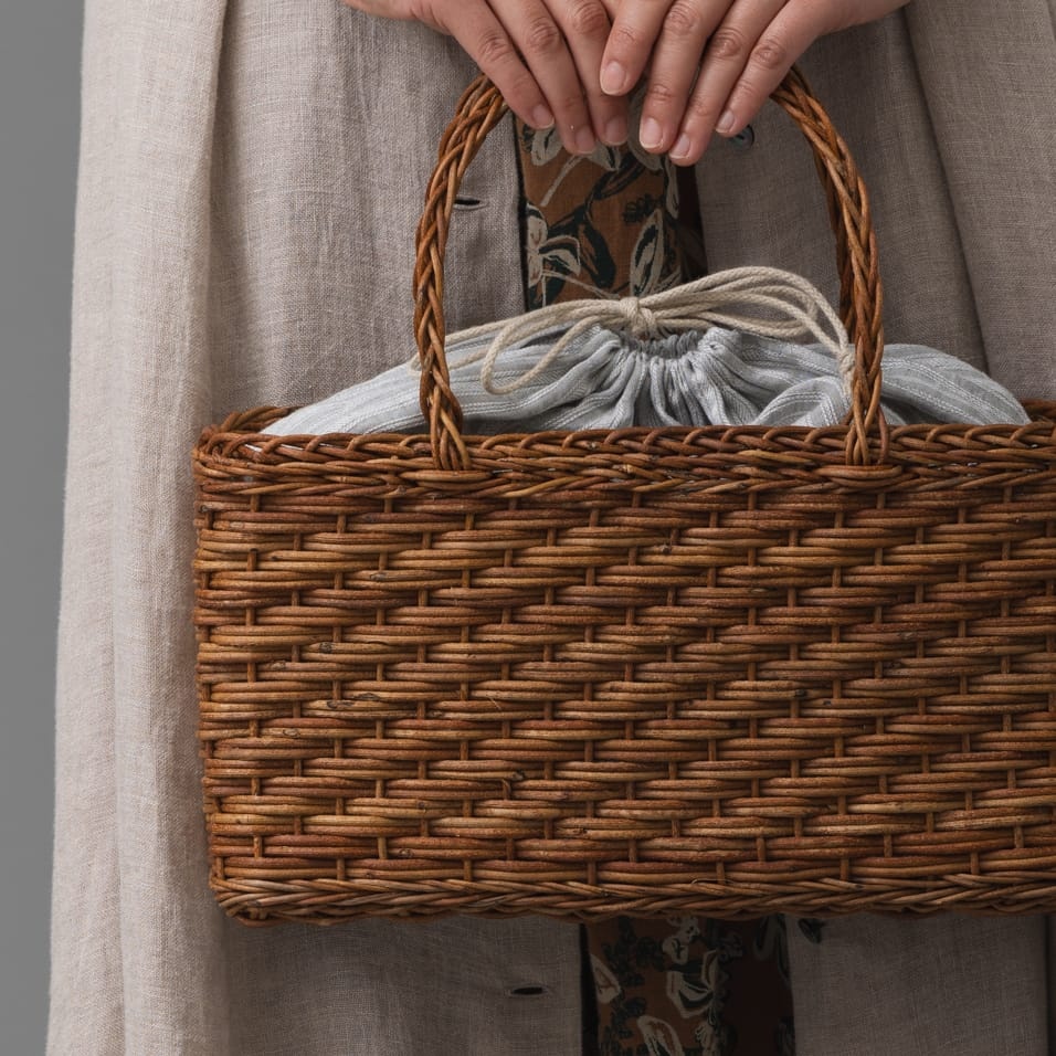 国産あけびのつるを1年以上乾燥させ、熟練の職人の手でひとつひとつ編み上げる、青森伝統の「あけび細工」。丈夫で使い込むほどに味わいが増す、一生もののバッグです。群言堂オリジナルの内袋は、取り外して単体で巾着としても使えます。