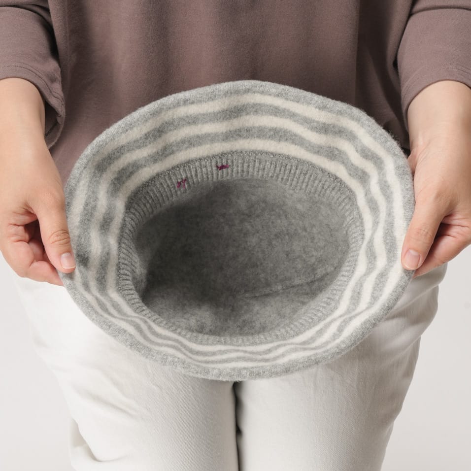 つば裏にストライプ柄をあしらって、若々しく仕上げたウールハット。つばをクルンと上げたり下ろしたりして、多彩な表情がつくれます。リボン代わりにあしらったリブ編みも小粋な印象で、冬のマリンスタイルによく似合います。