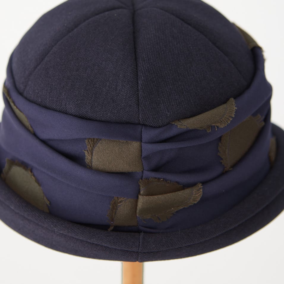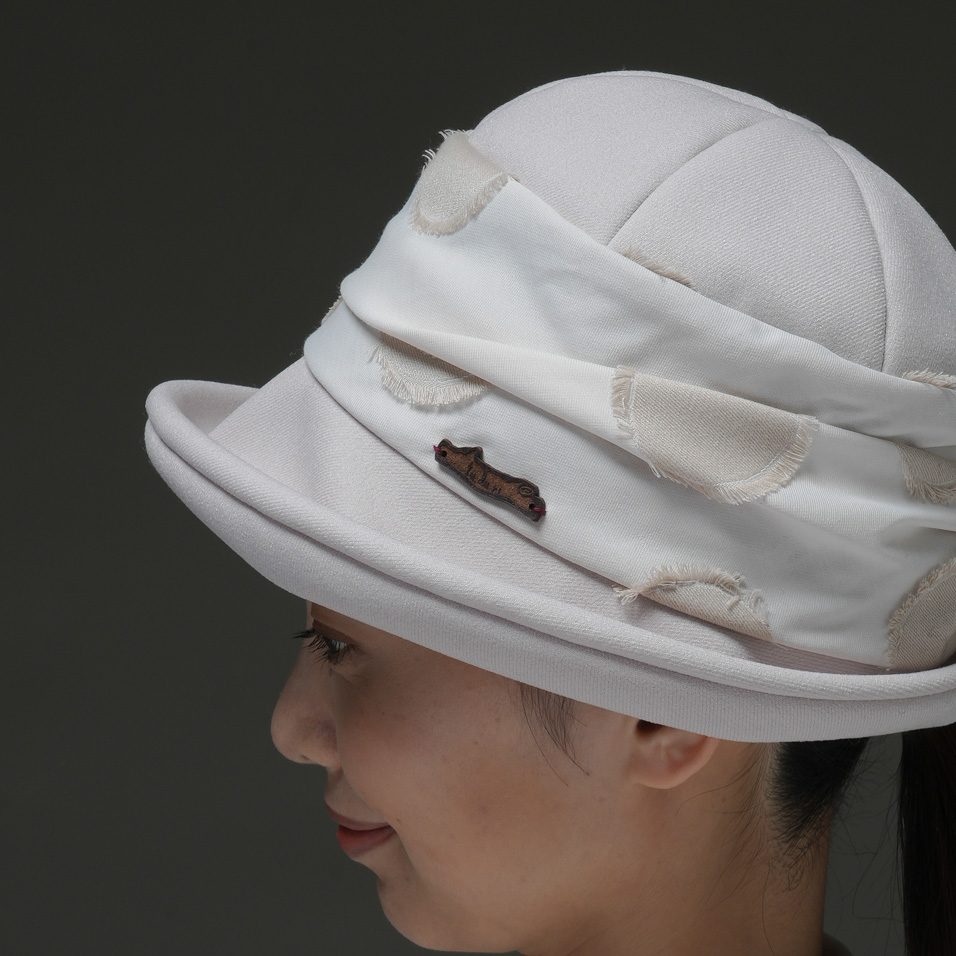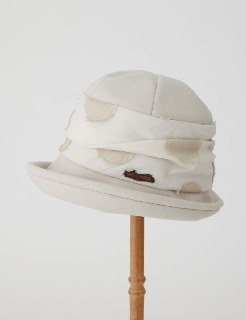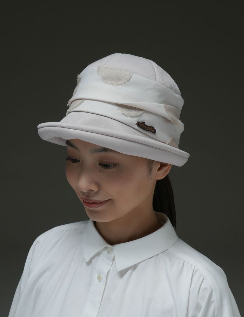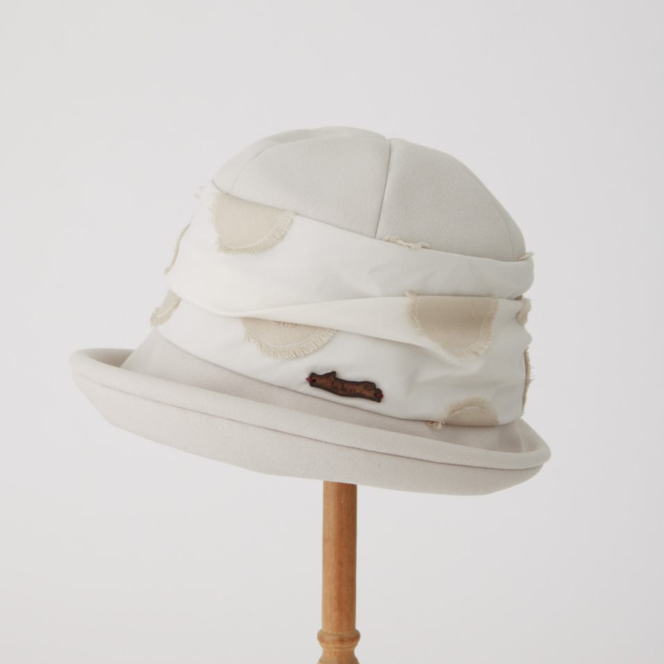 フランス・ブルターニュ地方由来のドーム型帽子「ブルトン」に、カット糸の表情が印象的な水玉模様テキスタイルをあしらい、ちょっとドレスアップした雰囲気に仕上げました。つばをクルンと上げたり下ろしたりして、多彩な表情をつくれるのも魅力です。