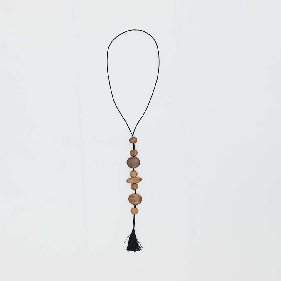 紫檀や黒檀を、つるりとした石ころのような表情に磨き上げてつないだネックレス。インパクトのある見た目ながら、軽いつけ心地は天然木ならでは。一重ならロング、二重ならショートと、二通りの表情が楽しめます。