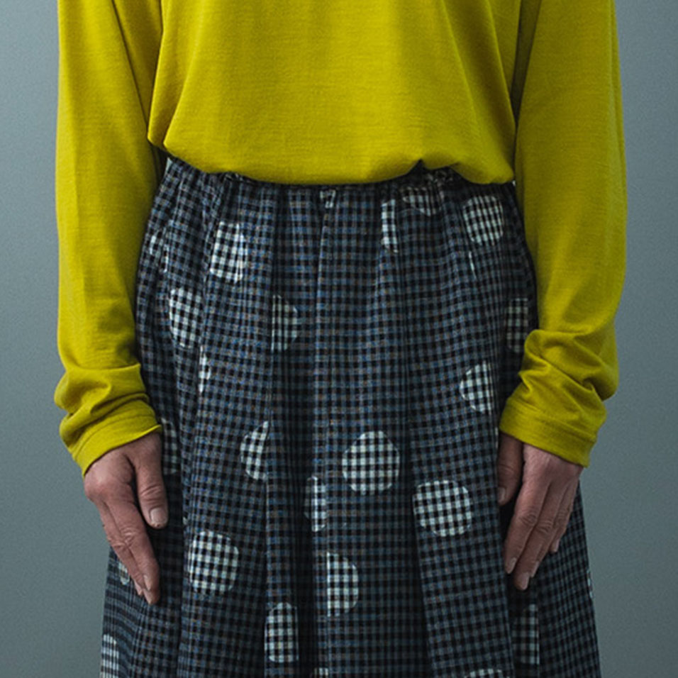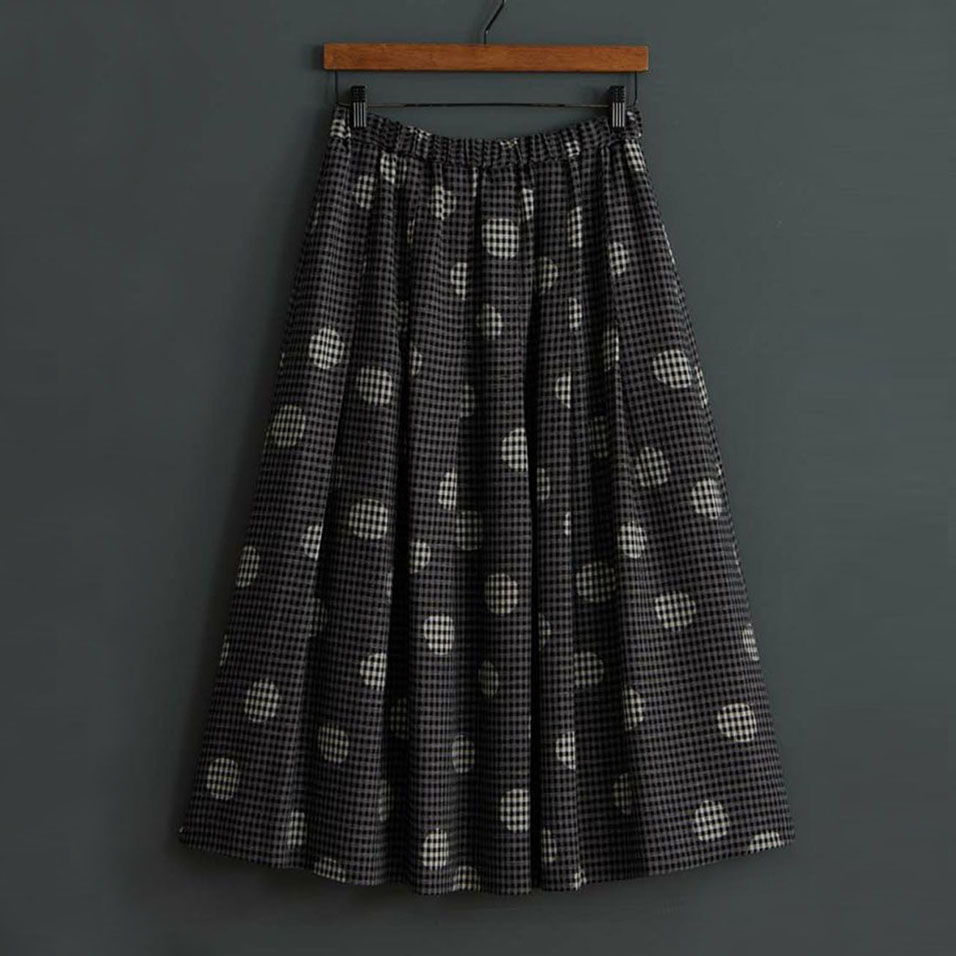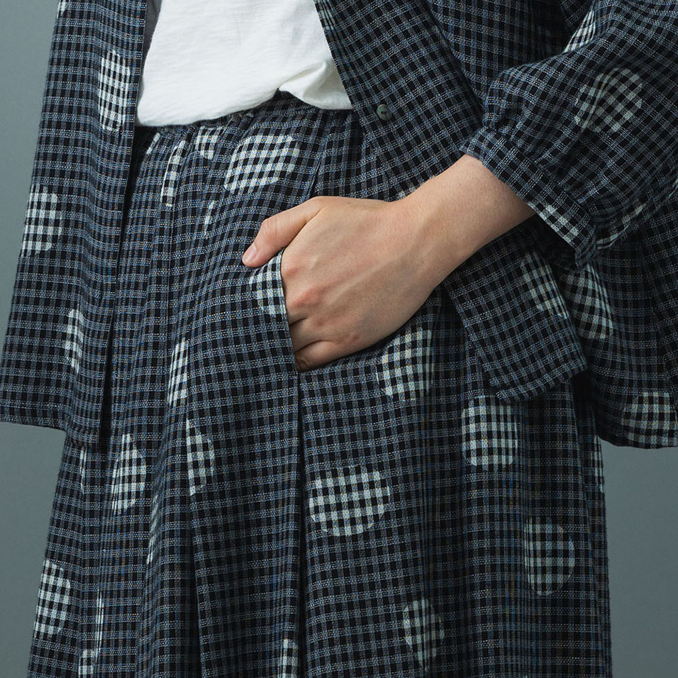 手描きの水玉柄とギンガムチェックが合わさった、新鮮なマンガン絣のスカート。落ち感がありドレープも美しく、キレイ色のトップスと組み合わせるのも得意です。裏地つきです。