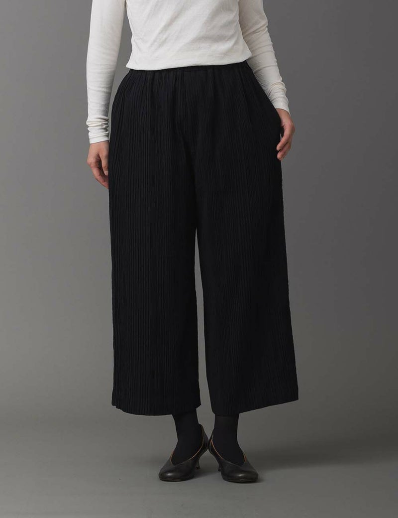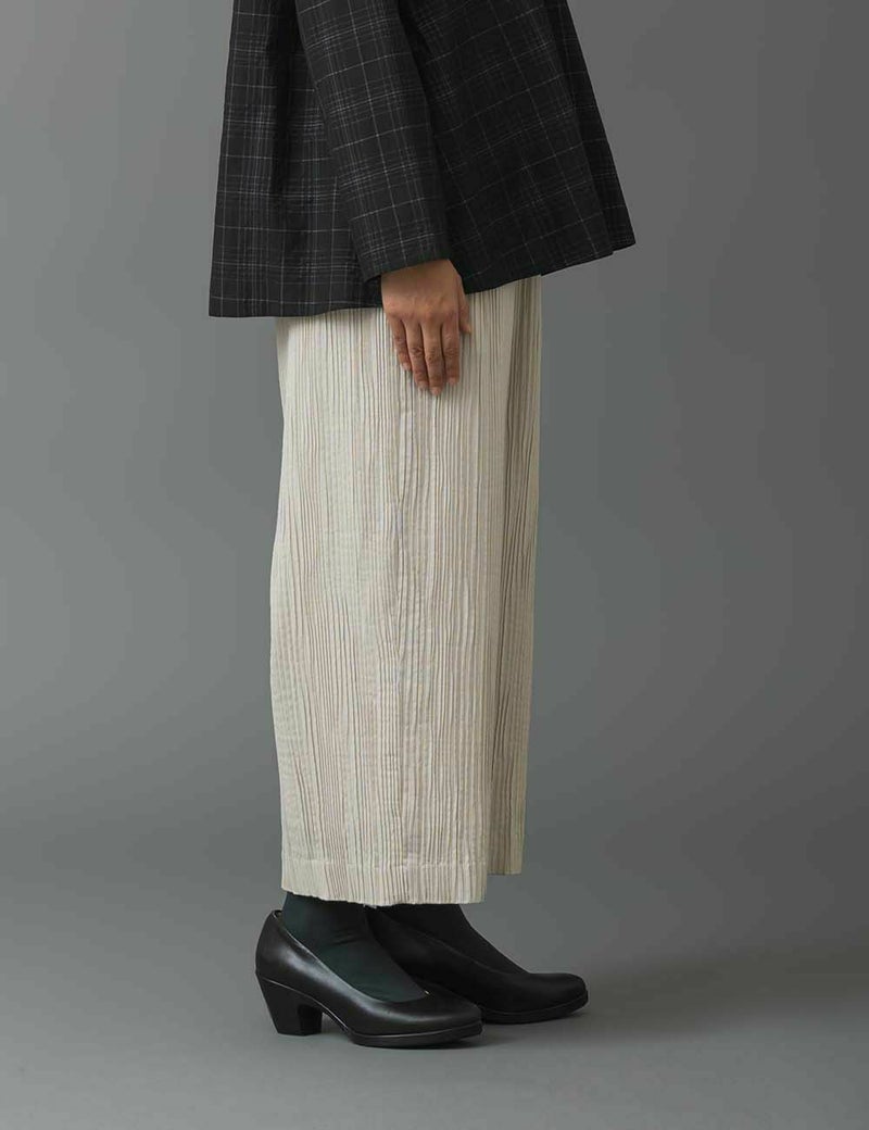 ランダムなプリーツの表情を主役にした、一枚で絵になるセミワイドパンツ。ほのかな艶感としなやかさが楽しめる綿シルクは、さらりとまとうだけで気分まで優美に。裏地付きの仕立てで、ちょっとおめかししたい旅行やお出かけにぴったりです。