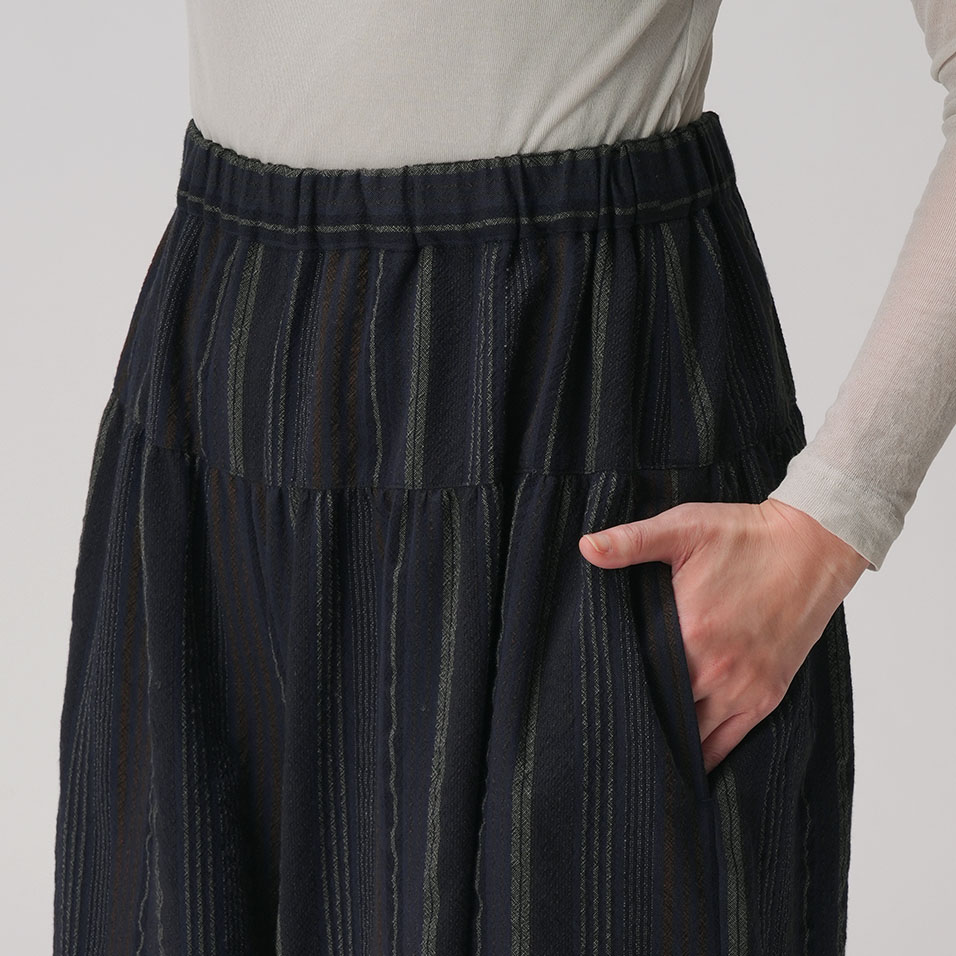 経糸(たていと)に綿糸とウール糸を縞状に並べ、緯糸(よこいと)に綿糸を織り込んだ渋い表情。完成した生地に洗いをかけることでウールを縮絨(しゅくじゅう)させ、ちぢみ織のような風合いに仕上げました。しゃきっとしたハリとぬくもりが同居する質感に、日本の伝統美を宿した色彩が映えます。