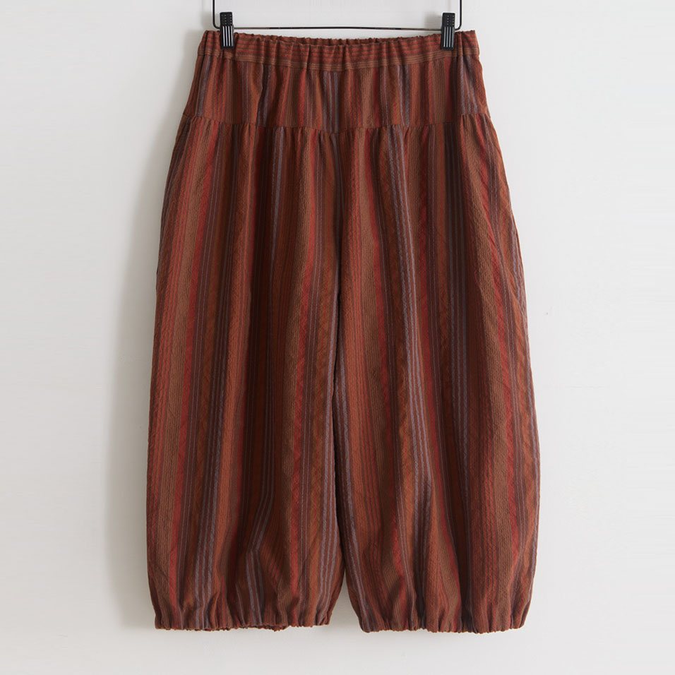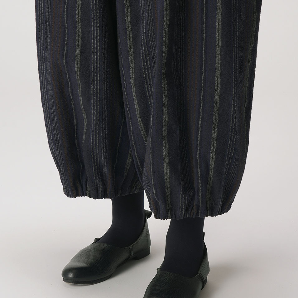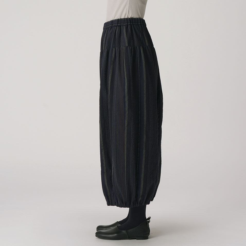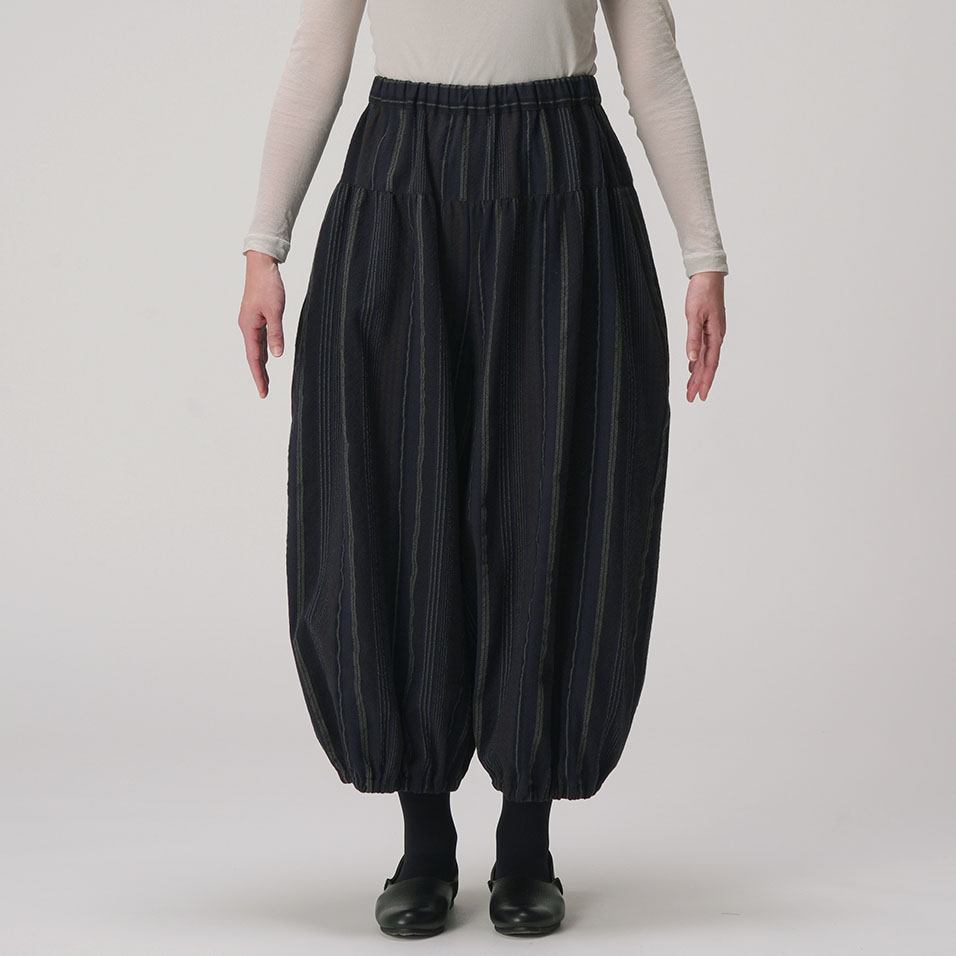 渋い色味の縞柄生地で仕立てた、ボリューミーなバルーンパンツ。はっと人目を惹きつける個性があり、着こなしの主役にうってつけ。体型悩みを隠して、着姿に自信を与えてくれそうです。背の高い方におすすめのMトールサイズもラインナップに加わりました。