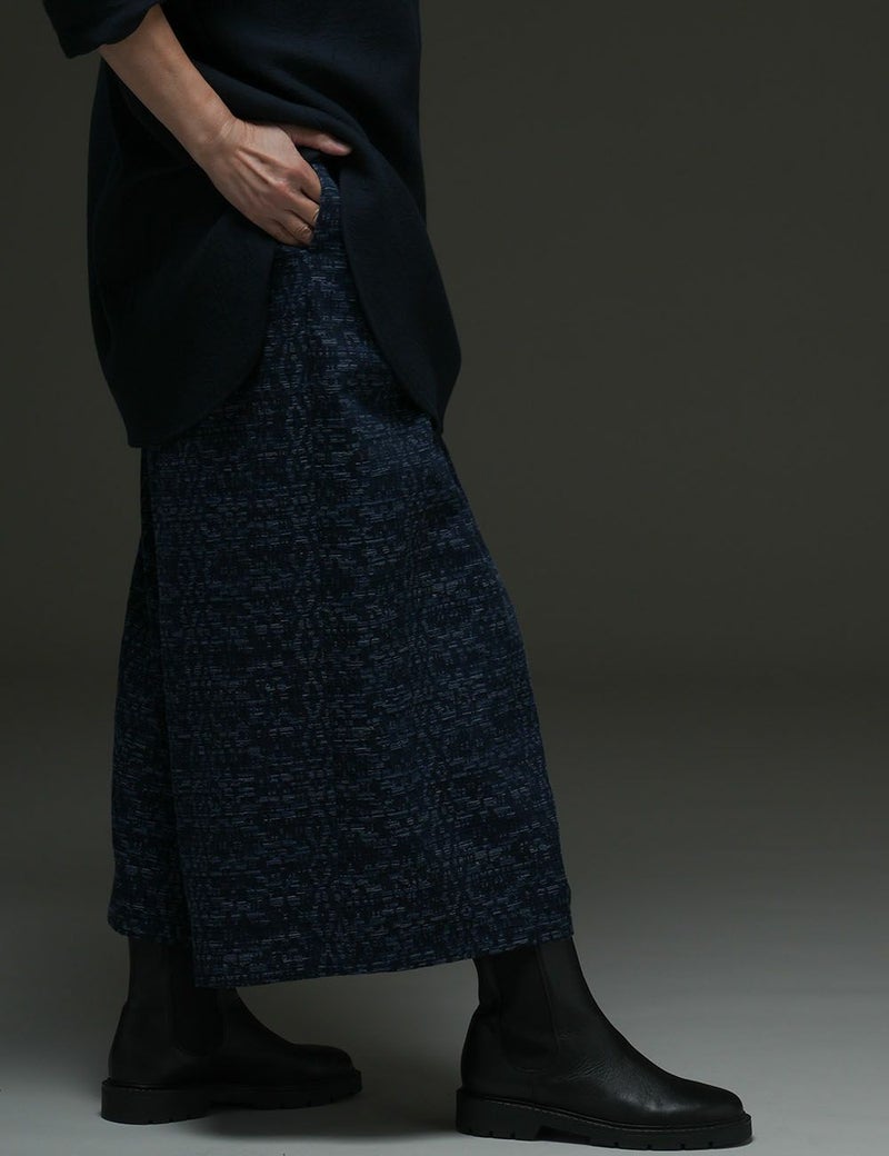 幾何学模様を絣のように浮かび上がらせたジャガード織が印象的な一着。スカート感覚で着こなせるラップパンツは、体型を問わずどなたにもよく似合います。長く付き合うほどに、美しいインディゴの濃淡が、自分だけの色合いに育っていくのも楽しみです。