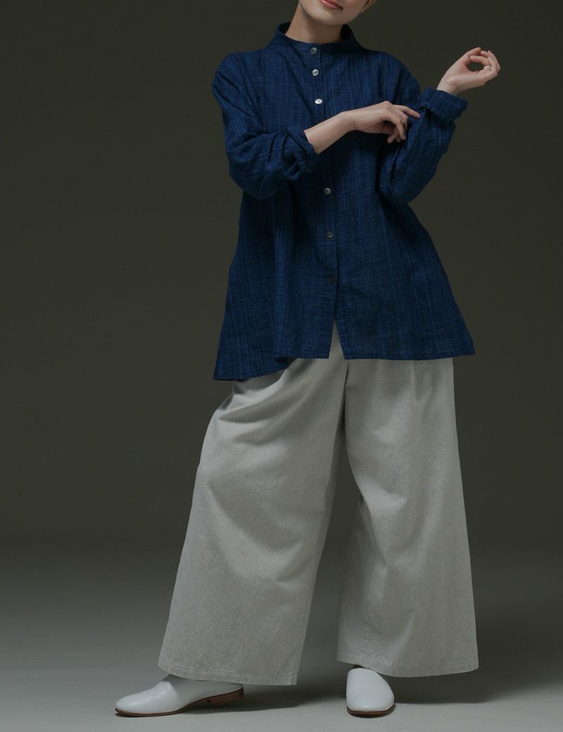 経糸(たていと)に綿糸、緯糸(よこいと)に綿麻混紡糸を使用した綾織生地。昔ながらの「カセ染め(糸をボビンに巻かず束の状態で染めること)」をした糸は、糸本来のふくらみが生きて、ほどよくハリ・コシのある上質な風合いをつくり出しています。裏表で違う色目があらわれる点や、帯電防止加工をほどこしている点も魅力。静岡の福田織物さんとつくり上げた自信作です。