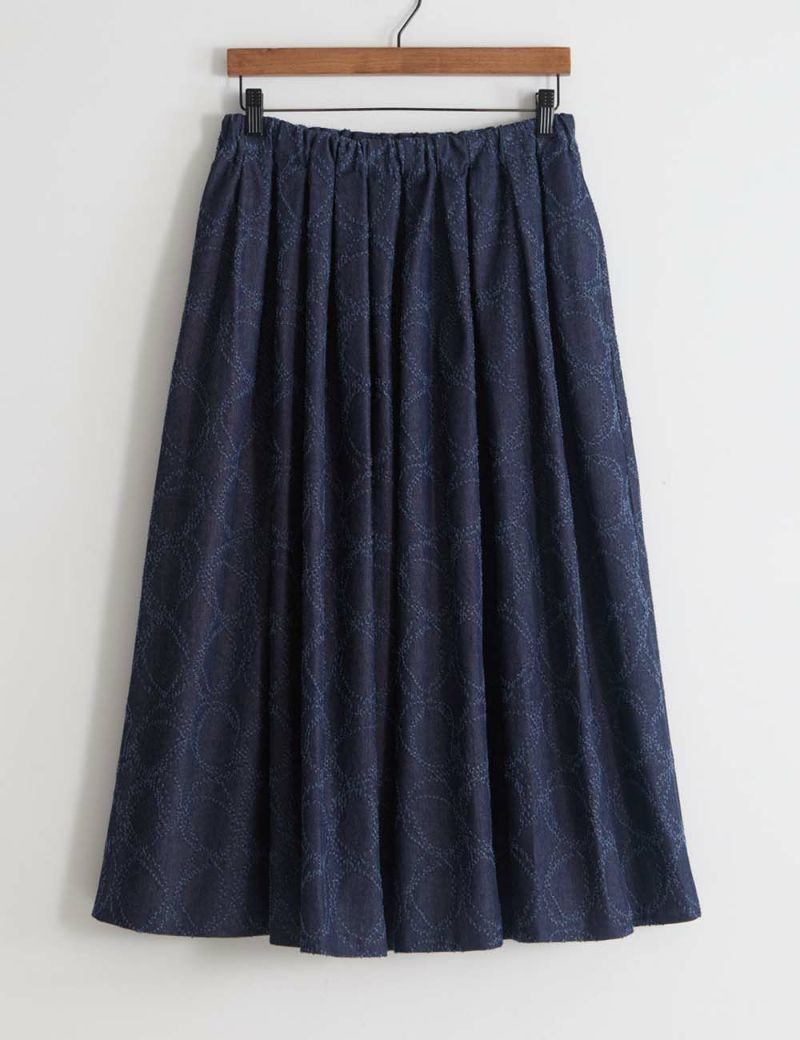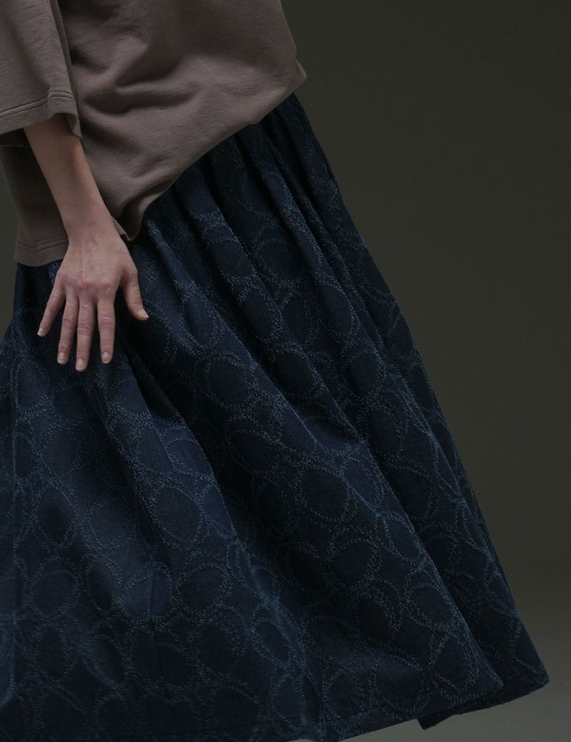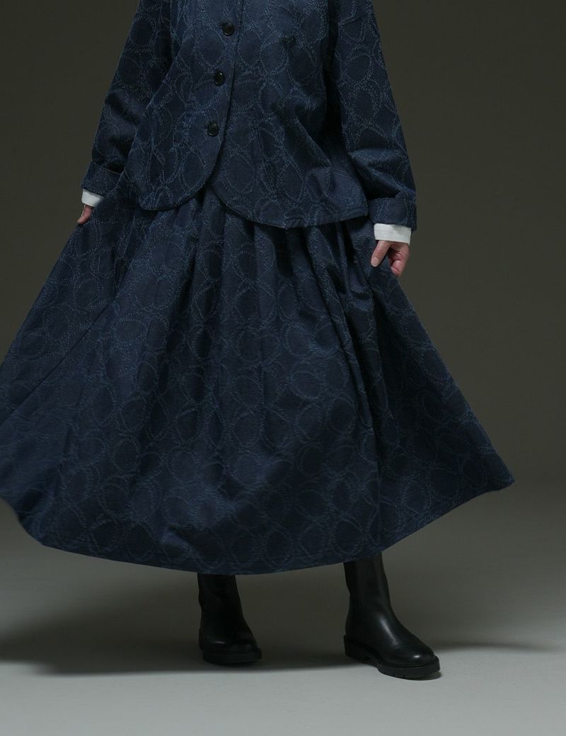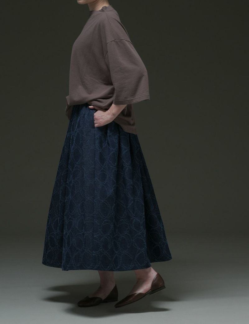 特殊刺繍をほどこした備後産デニムのスカート。ウエストから広がるタックが豊かなボリュームを描き出して、カジュアルさと華やかさの絶妙バランスを叶えています。共生地のジャケットと合わせれば、ちょっとおめかししたい場面まで幅広く活躍してくれそう。