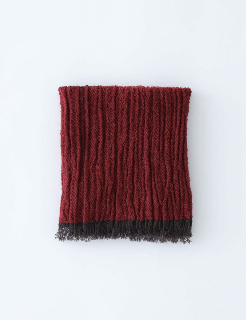 経糸(たていと)に綿、緯糸(よこいと)に綿強撚糸とウールを使用して、旧式シャトル織機でやさしく織り上げました。やわらかな伸びのよさと、あたたかな肌ざわりが魅力。波打つような風合いやフリンジも表情豊かで、無造作にまとうだけでしゃれた雰囲気に。