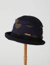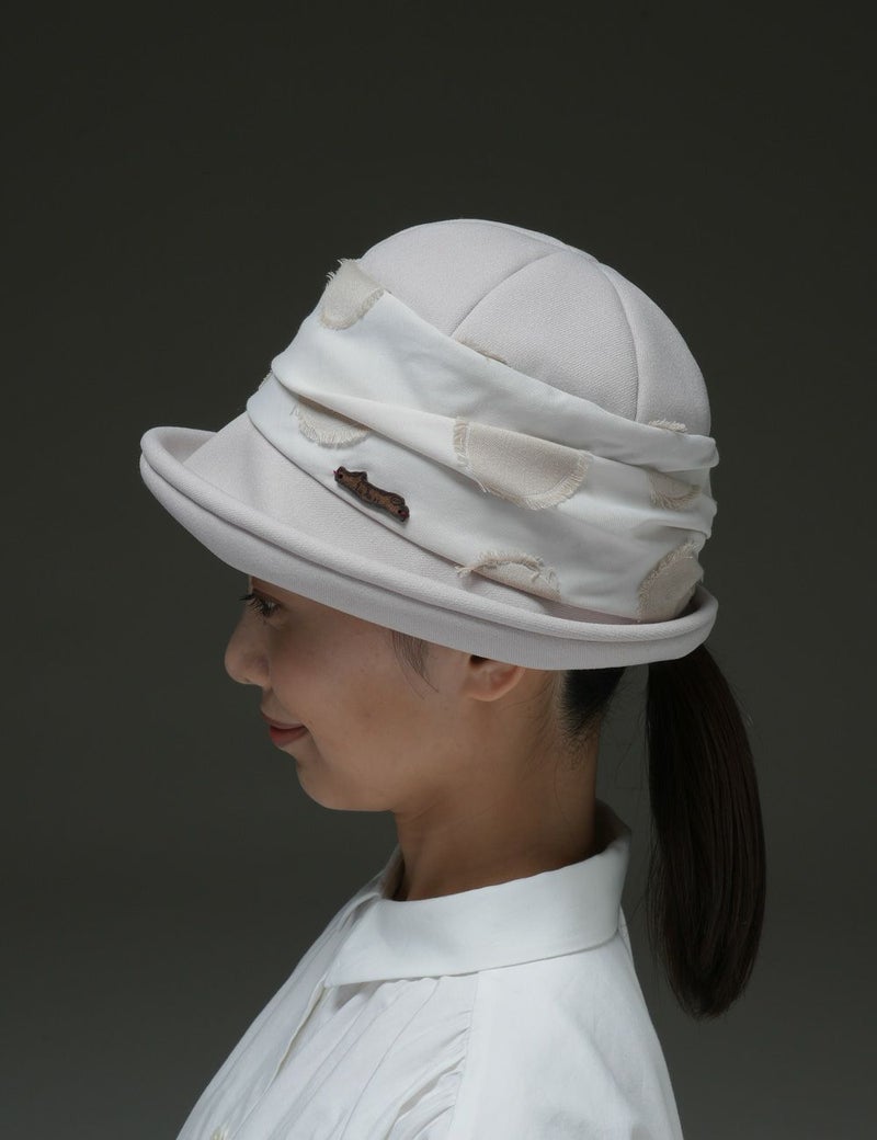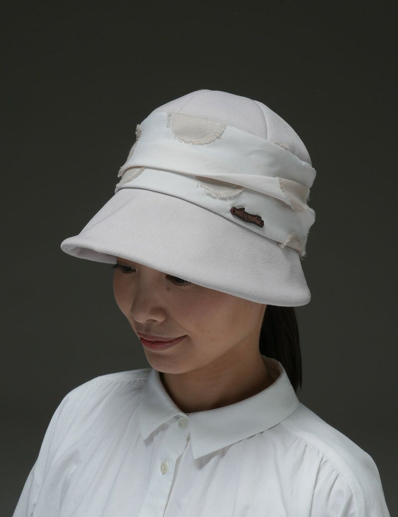 フランス・ブルターニュ地方由来のドーム型帽子「ブルトン」に、カット糸の表情が印象的な水玉模様テキスタイルをあしらい、ちょっとドレスアップした雰囲気に仕上げました。つばをクルンと上げたり下ろしたりして、多彩な表情をつくれるのも魅力です。