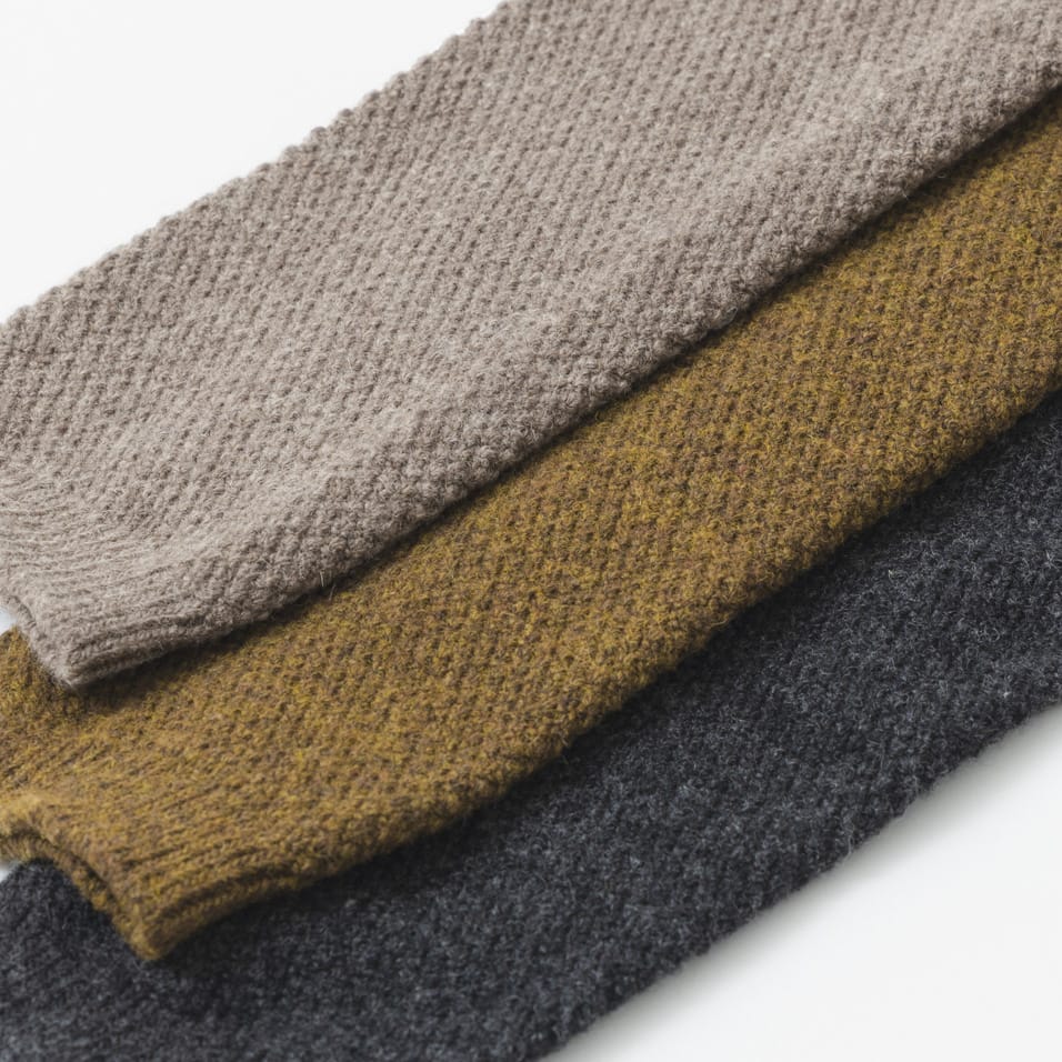 ぽこぽことした編地がかわいらしい、ウール素材を使ったアーム&レッグウォーマー。足や腕をやさしく包みあたためてくれます。普段使いにはもちろん、おうち時間のときにも使うことができ、寒い季節にあると便利な一枚です。