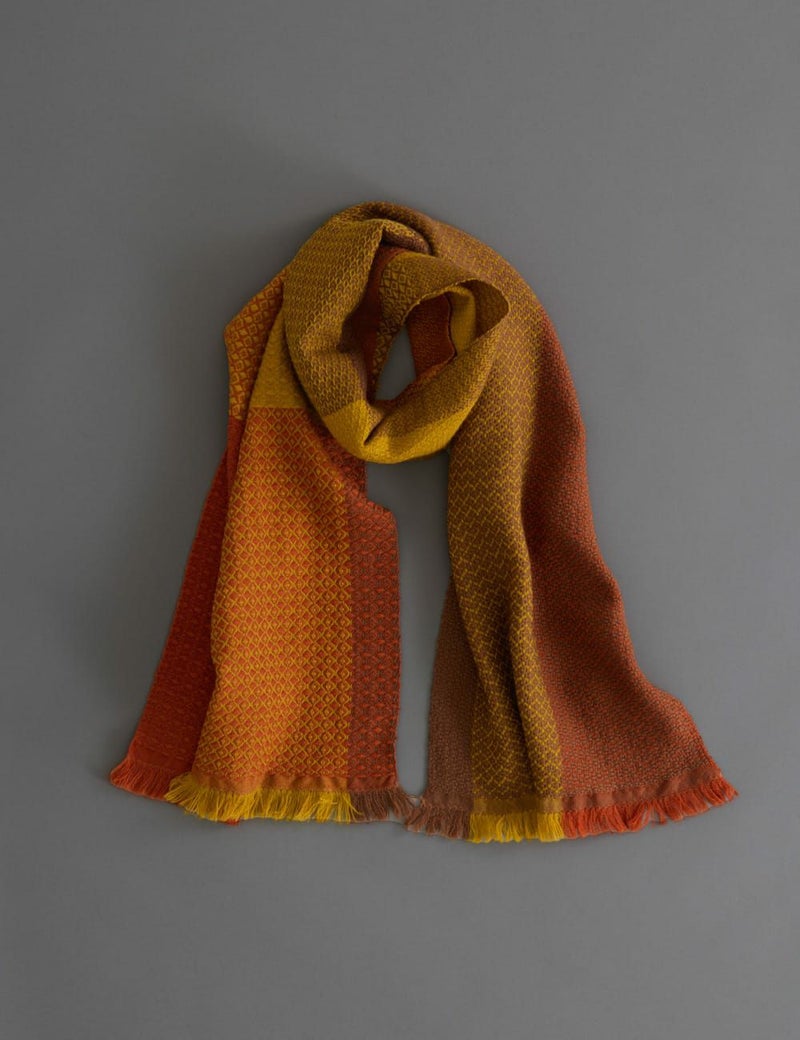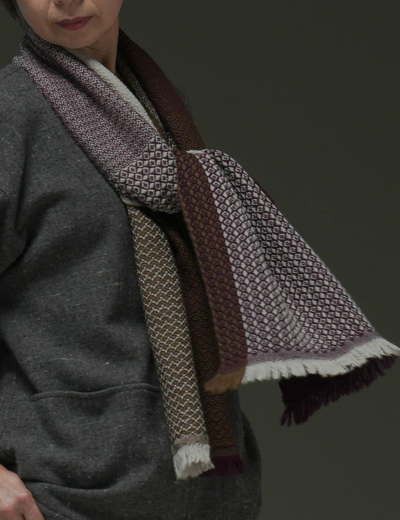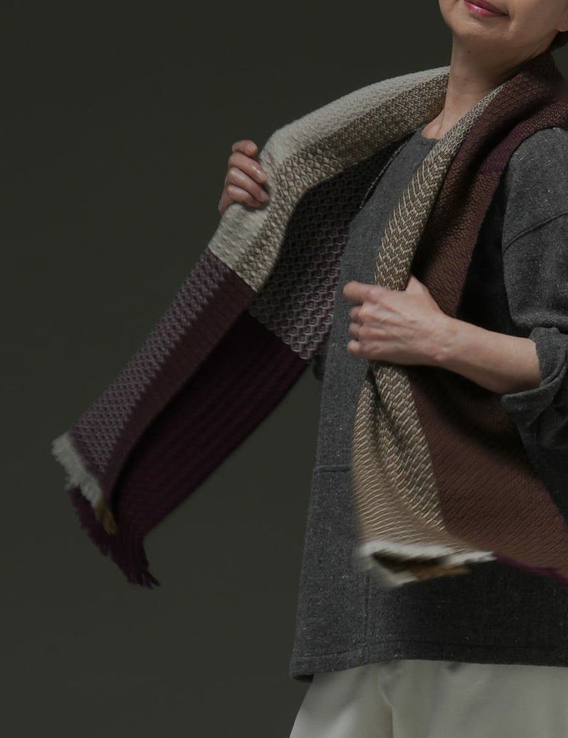 愛媛の工房織座さんと一緒にこだわりを形にした変わり織ストール。2種のウールを配合したふんわり軽い糸を、旧式シャトル織機でゆっくり、糸の風合いを生かしながら織り上げました。3種の織柄と配色の妙で、さらりとまとうだけで上質感は一目瞭然。