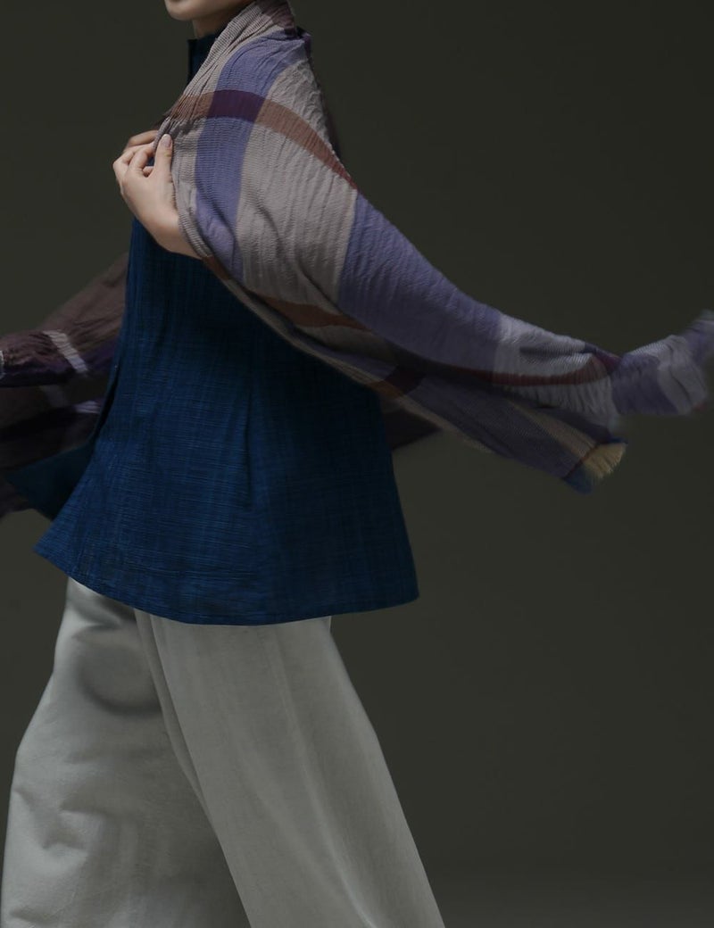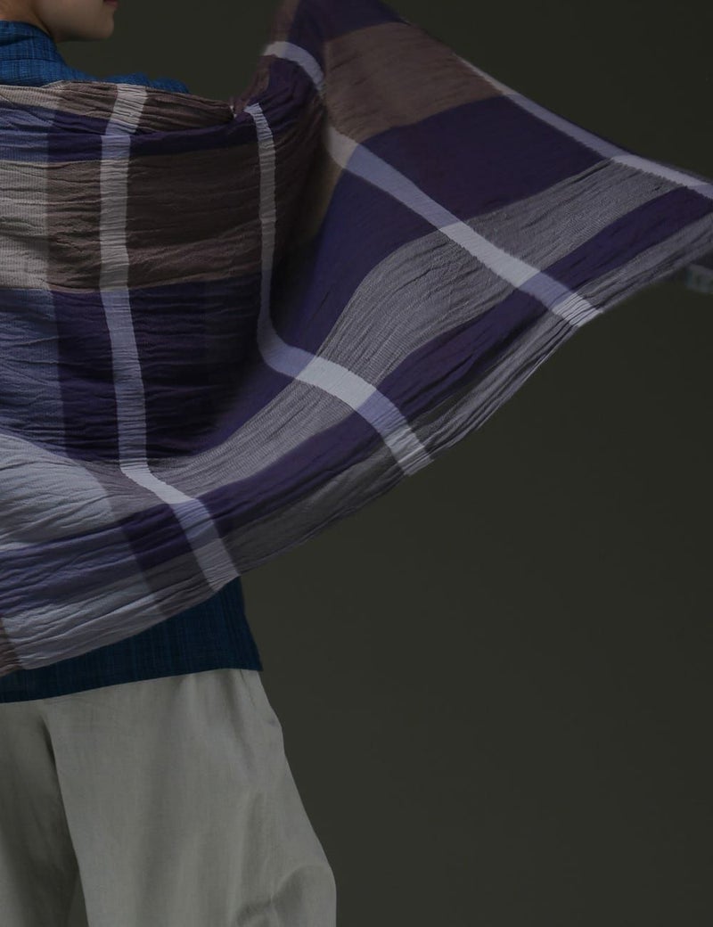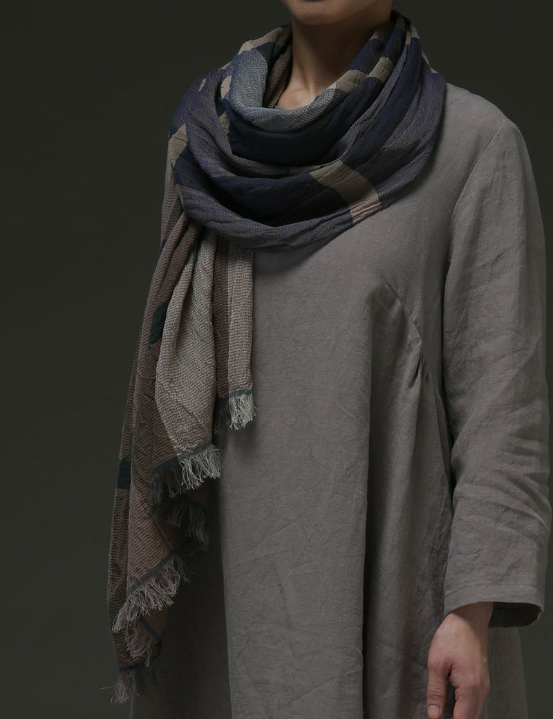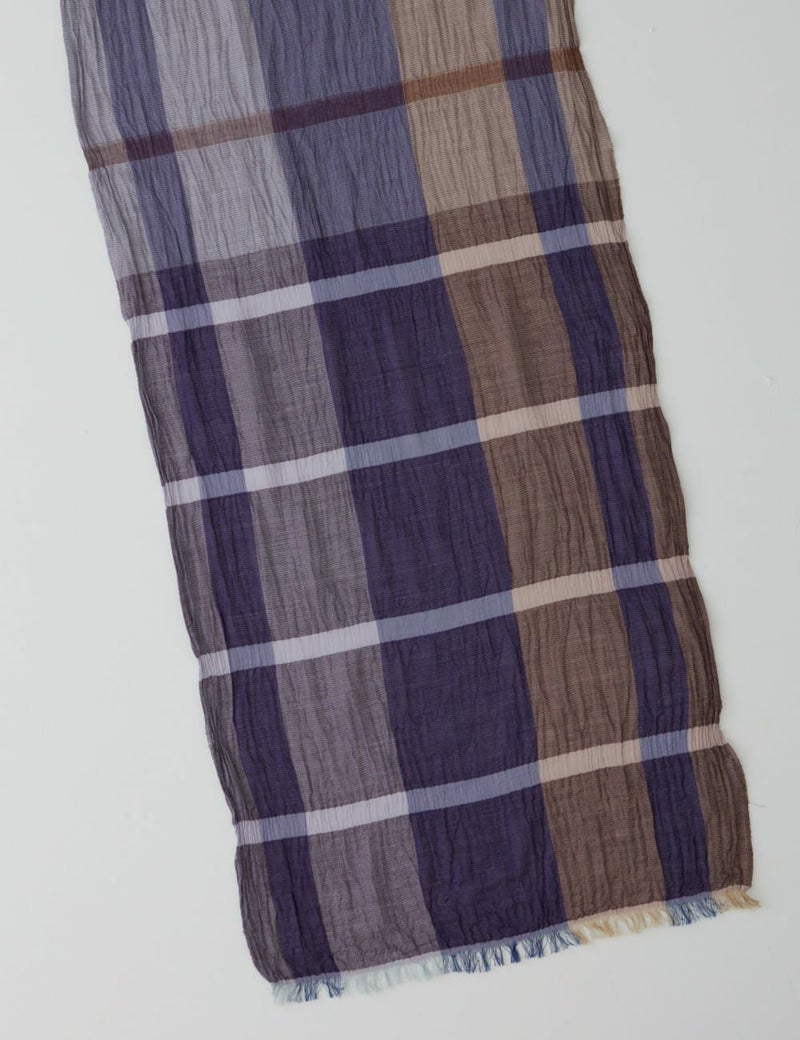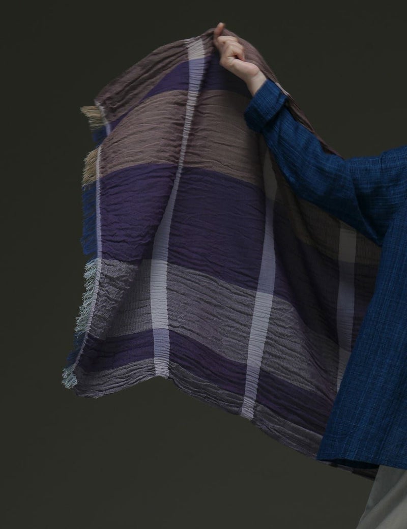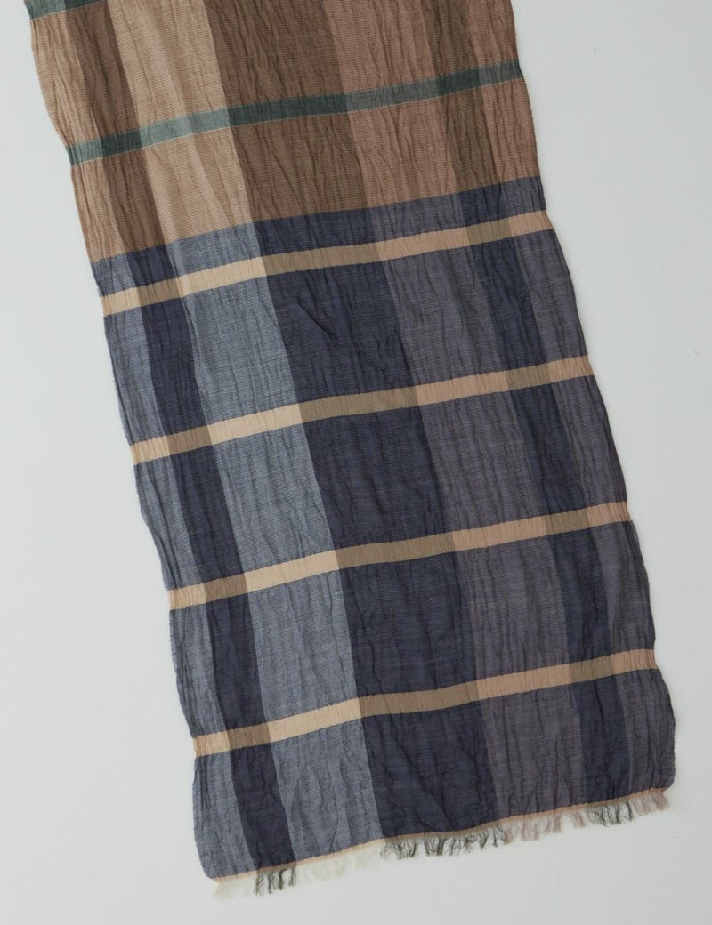 綿とエクストラファインメリノウールで織りなす、リラックスした表情が魅力のストール。愛媛の工房織座さんと、柄、糸、織り方にこだわって完成させました。たっぷりした大判サイズながら、軽やかな風合いで巻いてもかさばらず、ロングシーズン使えます。