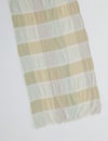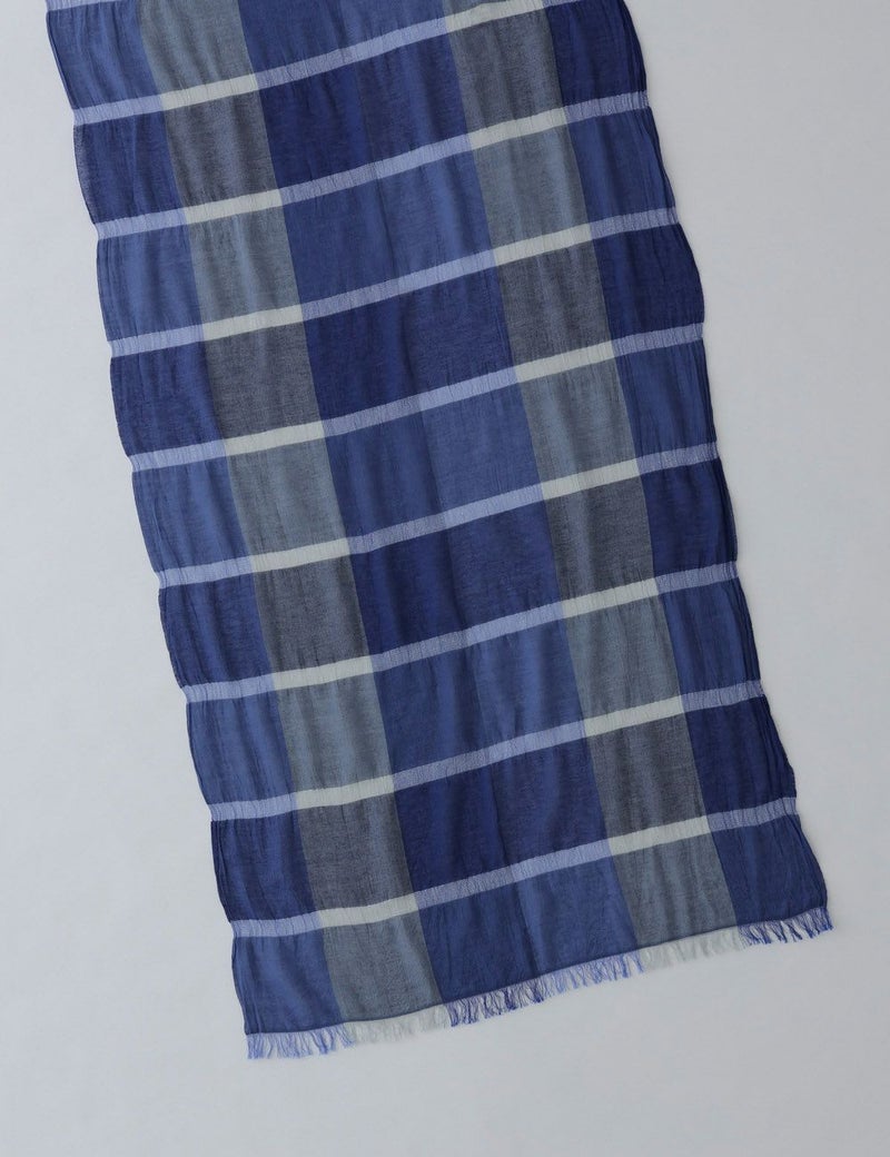 シルクのなめらかさと艶やかさに、綿と麻の自然な風合いをブレンドした薄手ストール。ブロックチェックに織り込まれた綿強撚糸の白ラインが縮絨(しゅくじゅう)し、生地表面に波打つような表情を与えています。無造作に巻くだけで美しく映える一枚です。