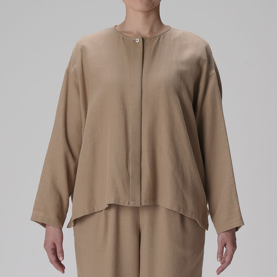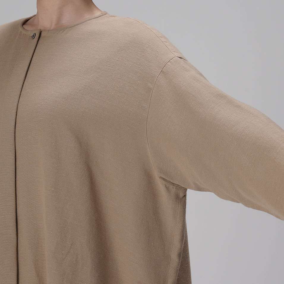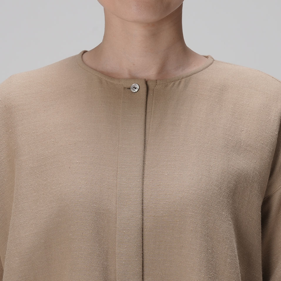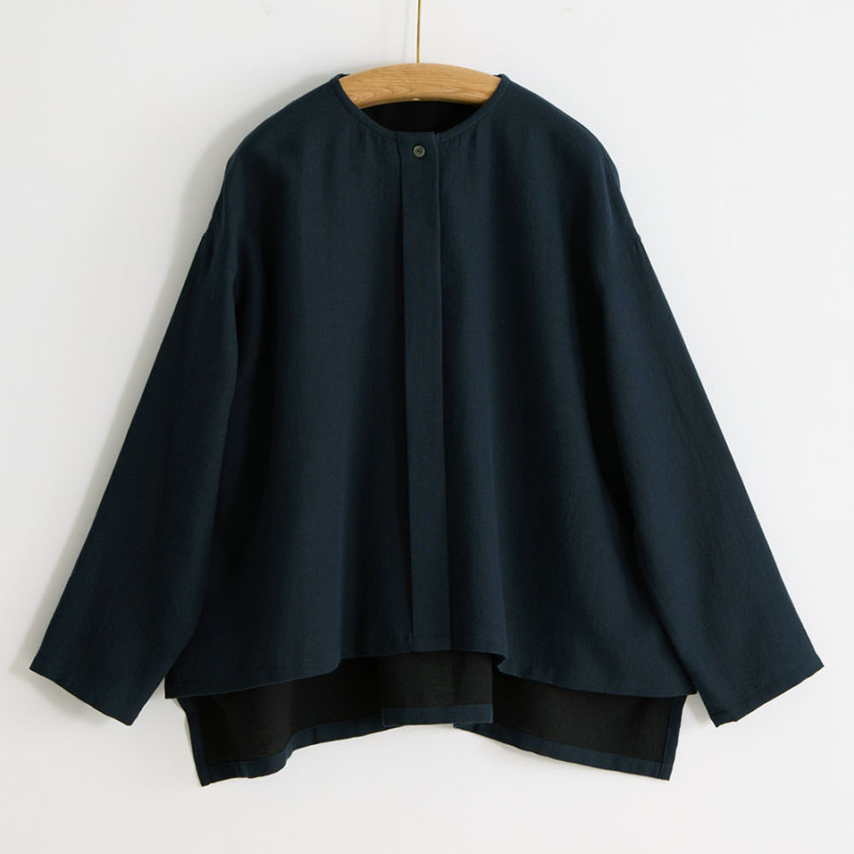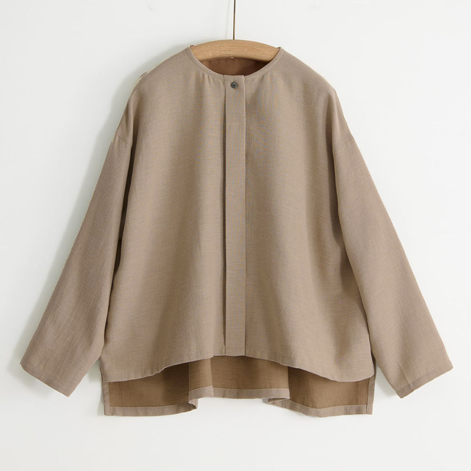 ブラウスと羽織ものの「一着二役」を叶える、ほんのりドレッシーなトップス。綿と麻とレーヨンの絶妙なブレンドがしっとり大人っぽい印象で、肌ざわりはナチュラルなのに素朴になりすぎないのが魅力。共生地のボトムスとのセットアップもおすすめです。