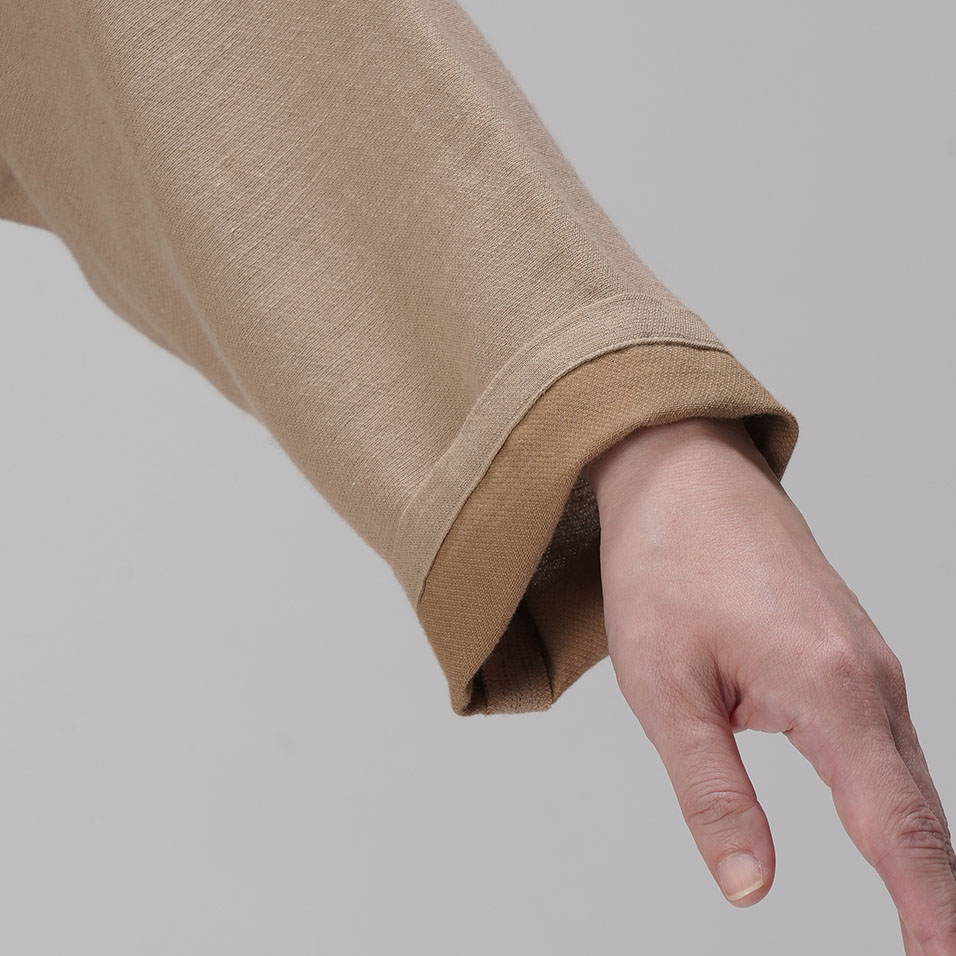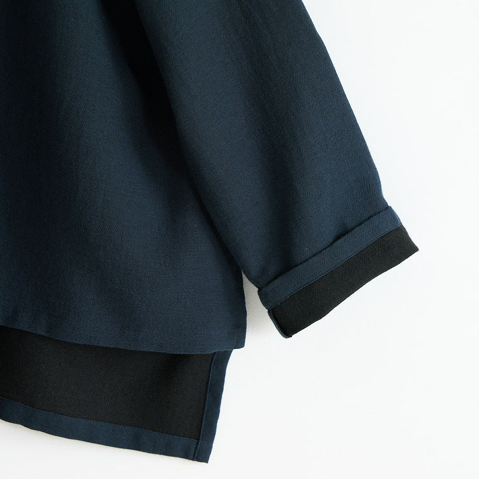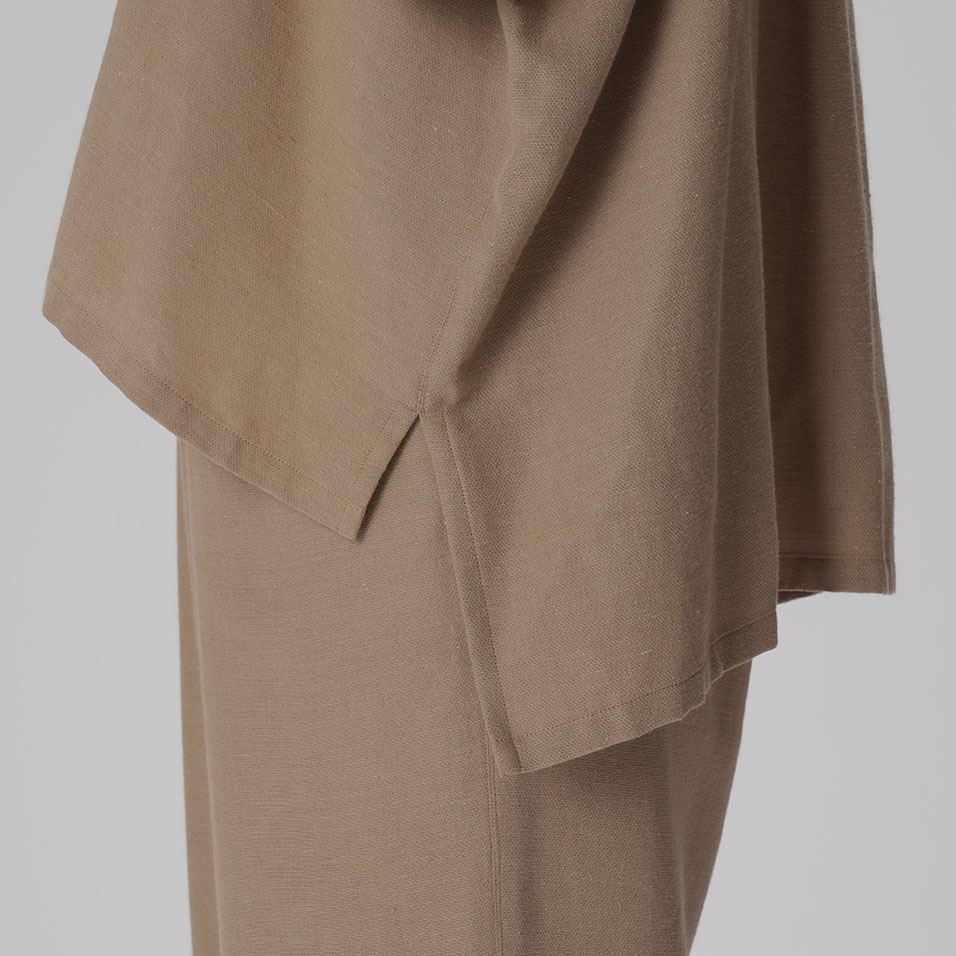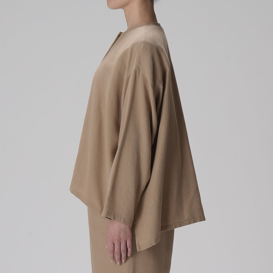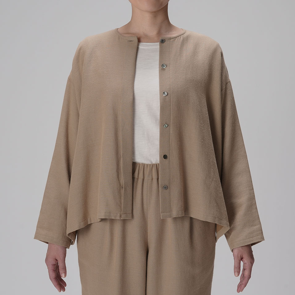 ブラウスと羽織ものの「一着二役」を叶える、ほんのりドレッシーなトップス。綿と麻とレーヨンの絶妙なブレンドがしっとり大人っぽい印象で、肌ざわりはナチュラルなのに素朴になりすぎないのが魅力。共生地のボトムスとのセットアップもおすすめです。