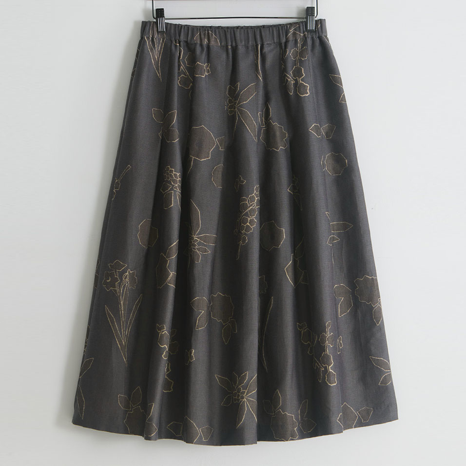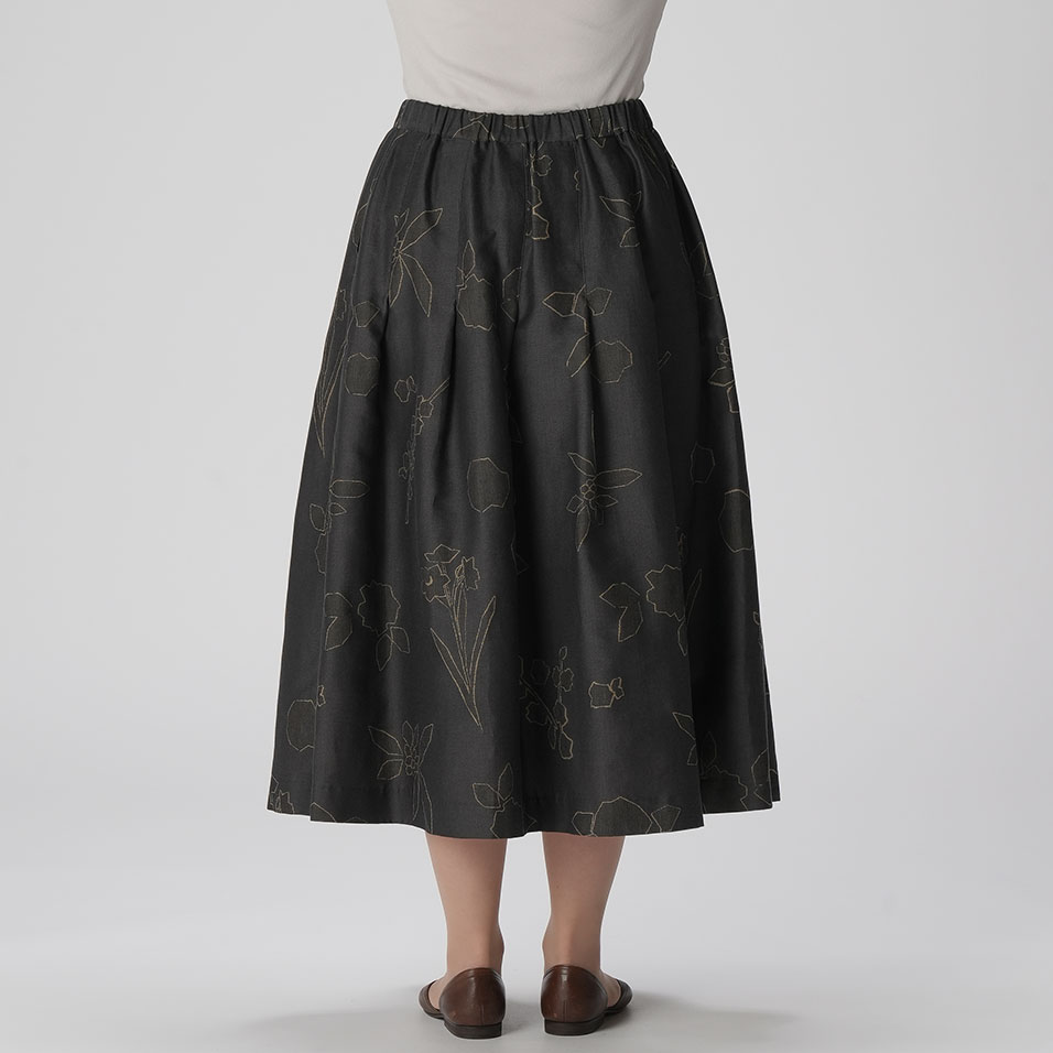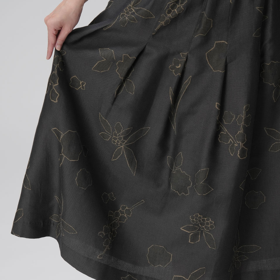 寒さにも負けず、健気に咲く花々の姿を描き出すスカート。ほんのり艶めく繊細なジャガード織生地が、タックフレアとともにふんわり広がって、クラシカルな上品さを醸し出します。共生地のプルオーバーと合わせれば、オケージョンにも活躍します。