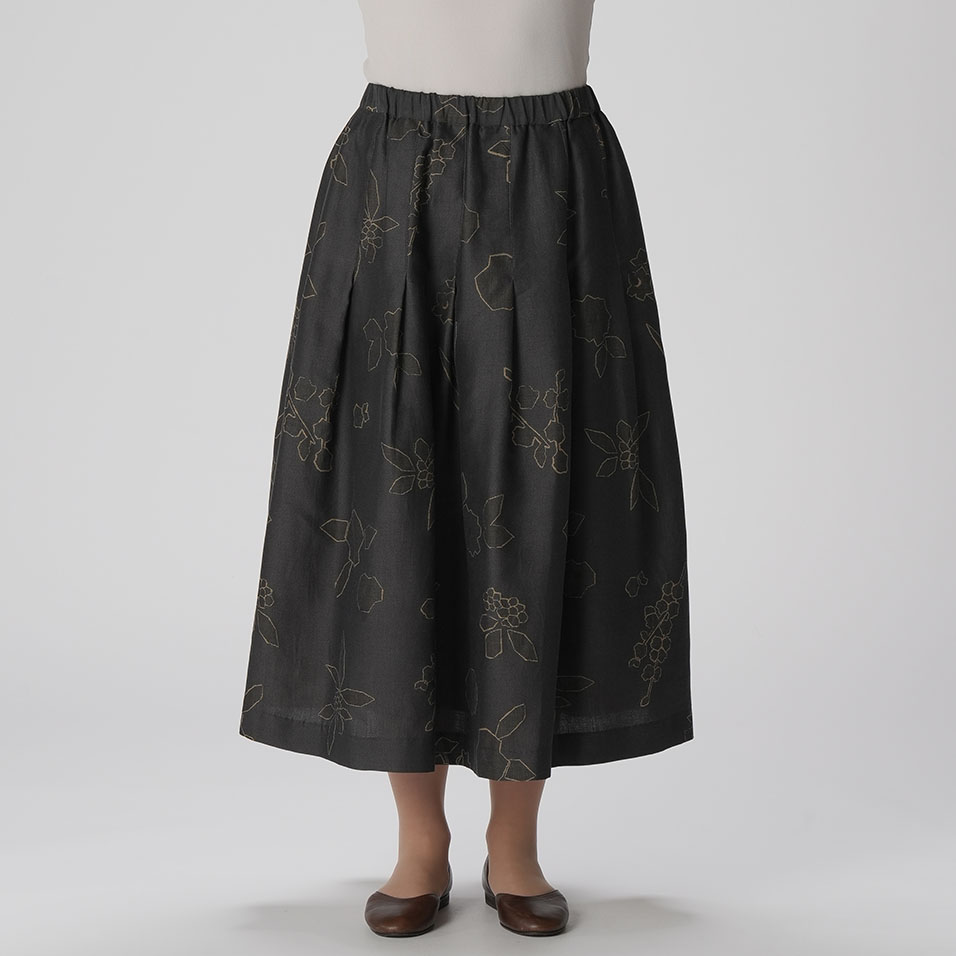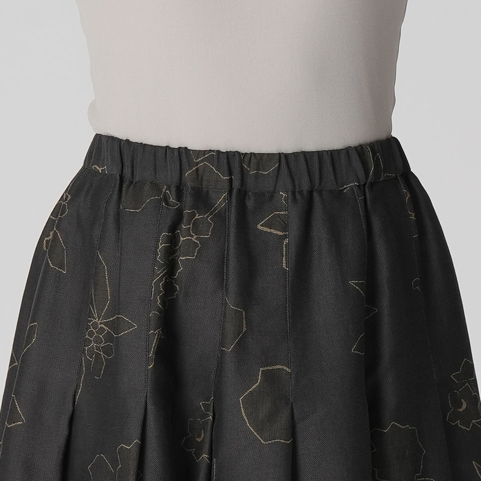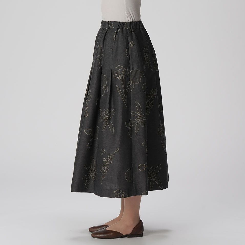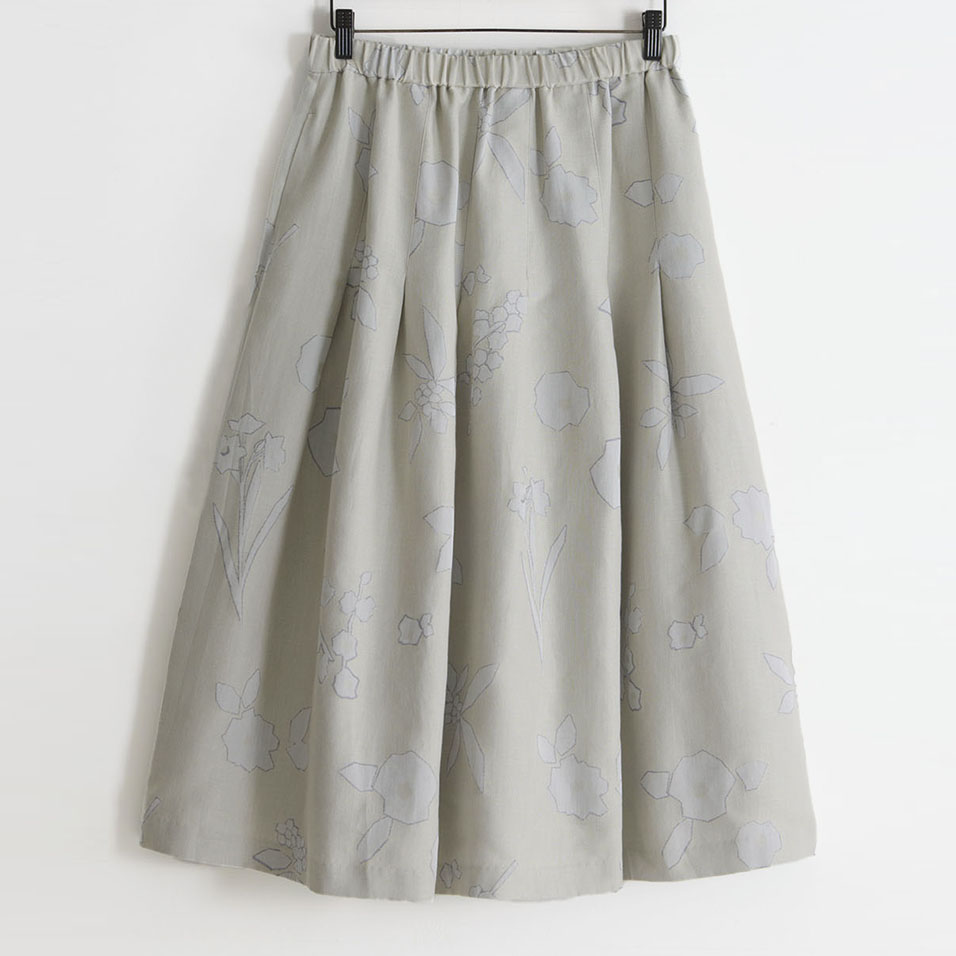 寒さにも負けず、健気に咲く花々の姿を描き出すスカート。ほんのり艶めく繊細なジャガード織生地が、タックフレアとともにふんわり広がって、クラシカルな上品さを醸し出します。共生地のプルオーバーと合わせれば、オケージョンにも活躍します。