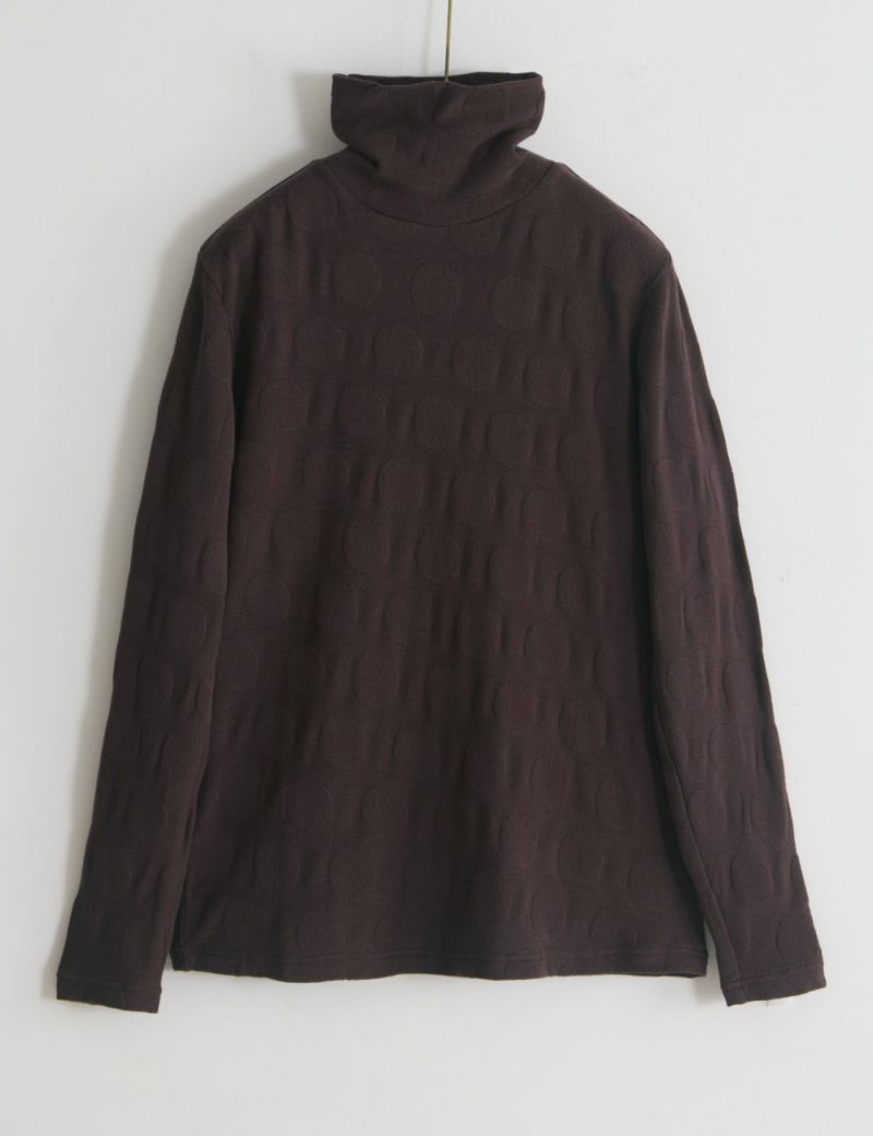 遠目には無地のようにも見える中に、ドット柄がさりげなく編み込まれています。インナーでも一枚でも着やすい、とてもソフトな着心地です。