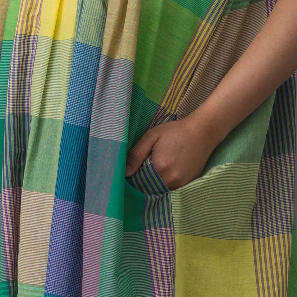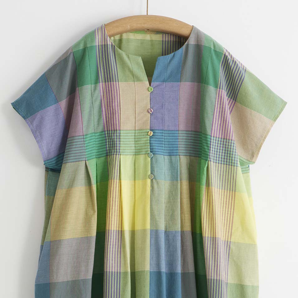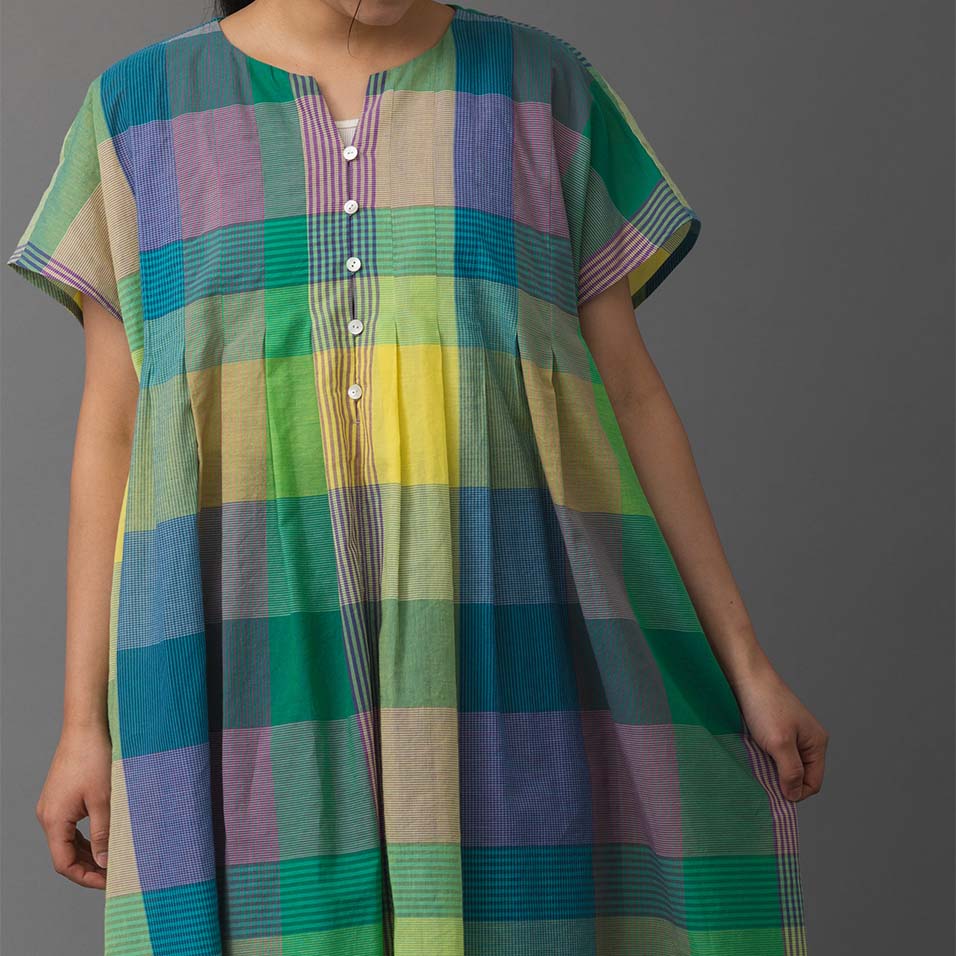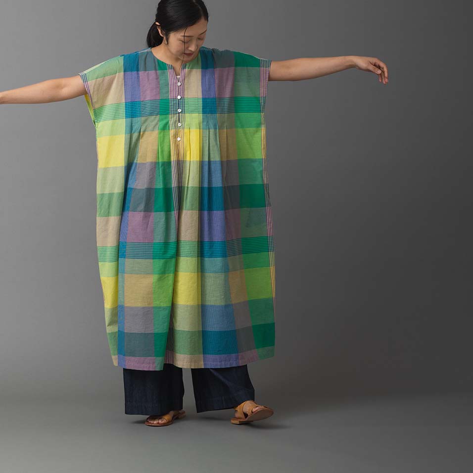 細番手の糸を織り上げた、しなやかな薄手生地。経糸(たていと)と緯糸(よこいと)合わせて11色もの糸が織りなすチェック柄は、無地柄に比べて何倍もの手間がかけられた、贅沢なものづくりのたまもの。思いがけない色の組み合わせが楽しく、まとうだけで心はずむような魅力にあふれています。
