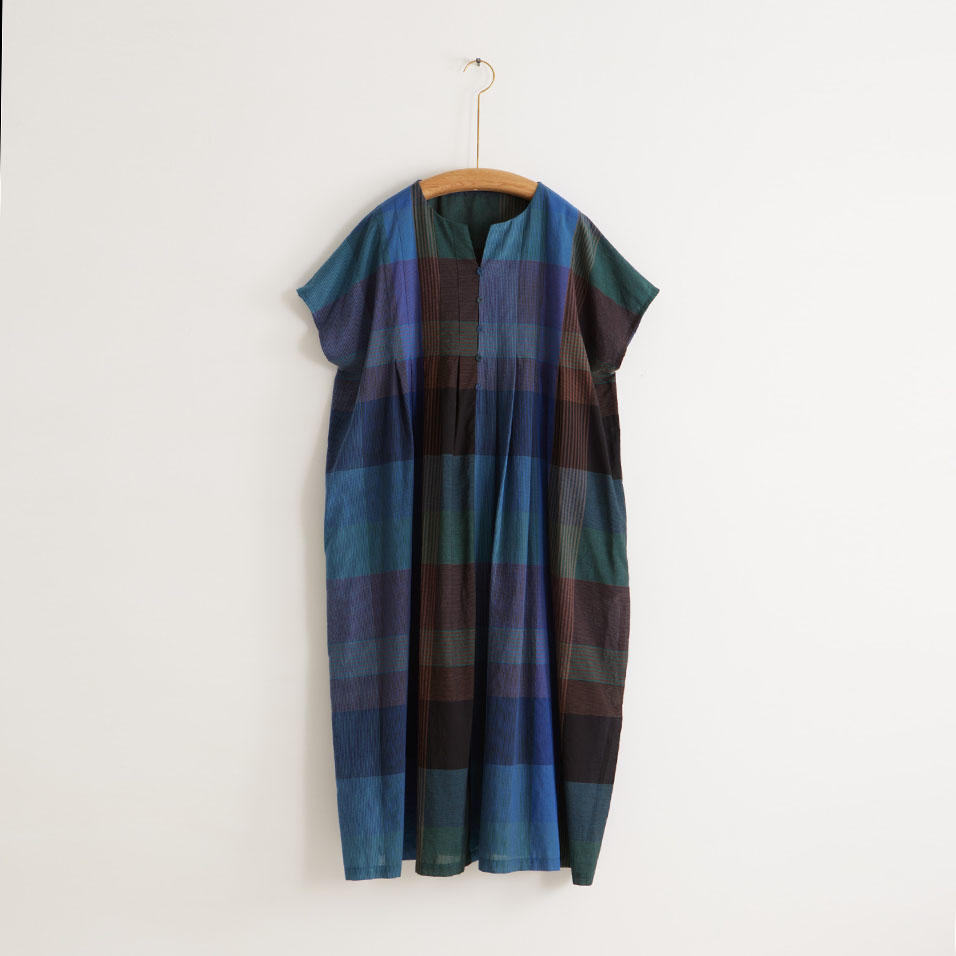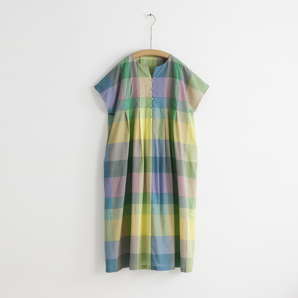 フロントに並んだループボタンや、胸元から広がるタックが印象的な、大柄チェックのワンピース。薄くしなやかな風合いで、さらりと軽やかな着心地です。リラックスした表情の中にも砕けすぎないおしゃれ感があり、海や高原の避暑地にもよく映えます。