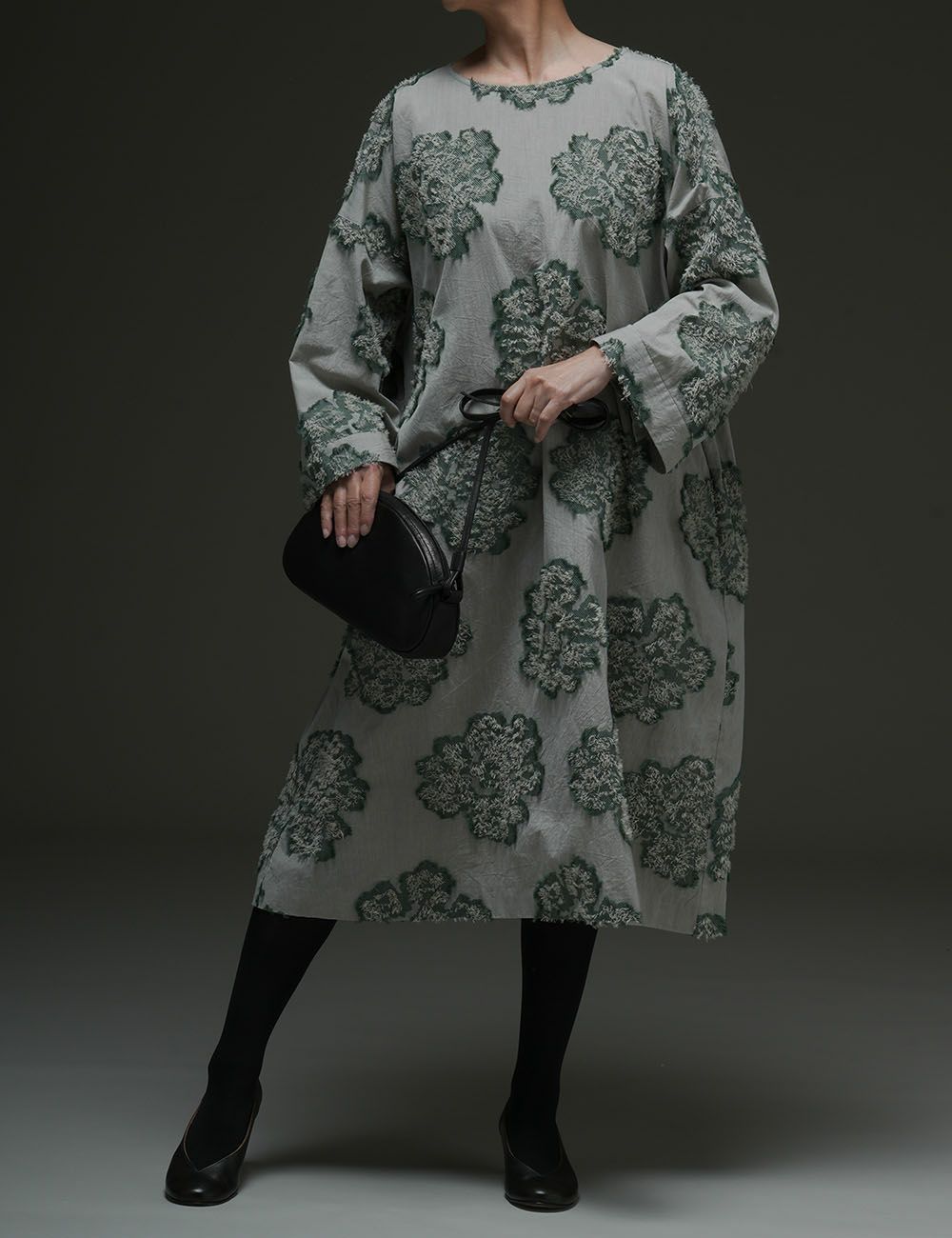 手の込んだジャガード織生地を贅沢に使ったワンピース。カット糸の表情がいきいきとして、寄り添って咲く野花の群れが、まるで大輪の花のよう。背中からたっぷり広がるギャザーの効果で、後ろ姿まで華やいで、見る人の心に強いインパクトを残します。
