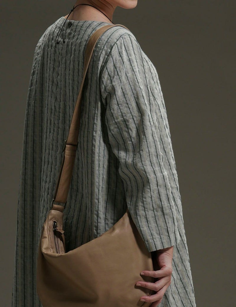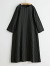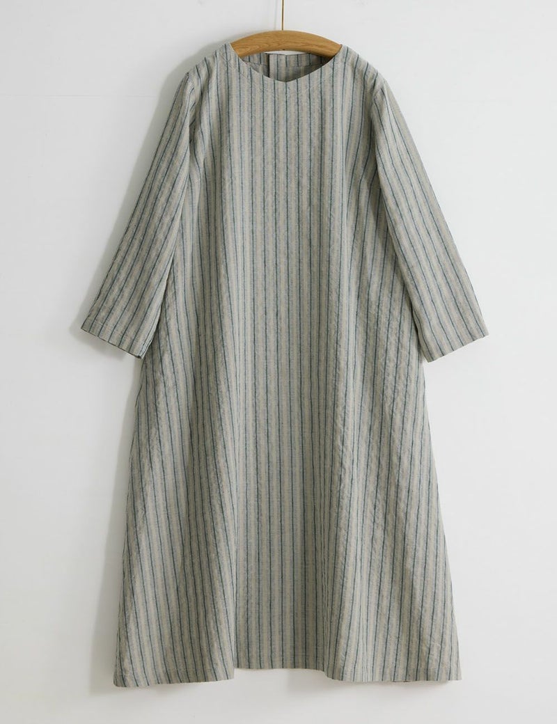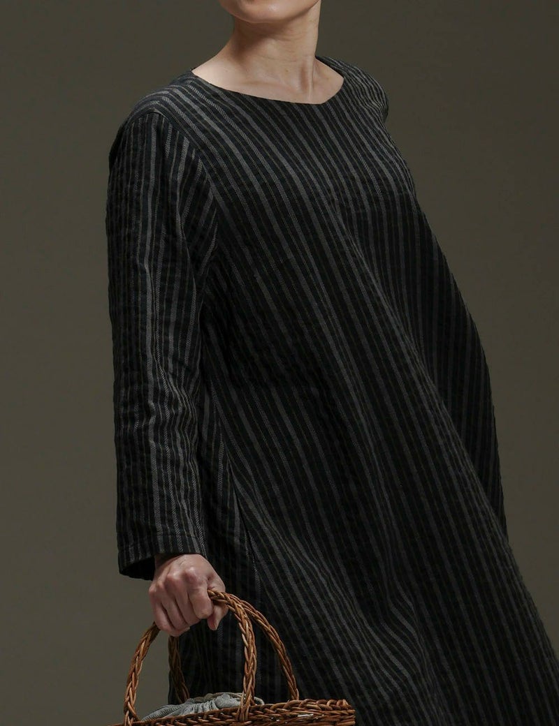 ドビー織の織柄がつくり出すストライプを生かしたワンピース。シンプルな仕立てで、流れるような縞の美しさを際立たせました。手の込んだ柄ににじみ出る渋い凛々しさと、綿麻の爽やかさが出会って、存在感あふれる一着に。