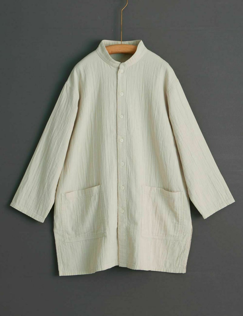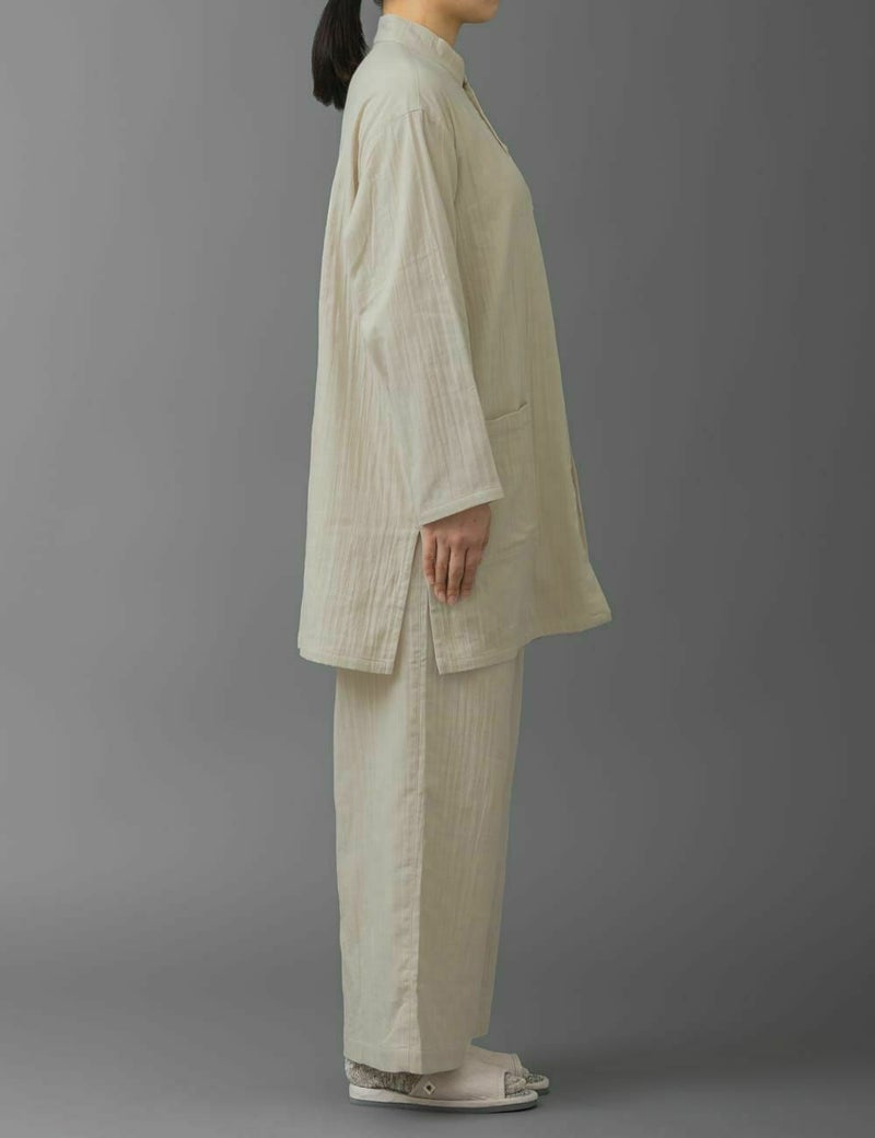 こだわりの綿織物を手がける静岡の福田織物さんとつくった、表と裏で風合いが異なる二重ガーゼ。肌に触れる内側は、甘撚りの糸をふんわり甘く織り上げて、やわらかさを追求。外側は、極細の糸を密に織り、毛羽立ちの少ないなめらかな質感に仕上げました。表情豊かなシワ感にふっくらと空気を含んだ着心地は、一度味わえばクセになります。