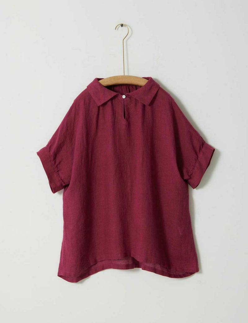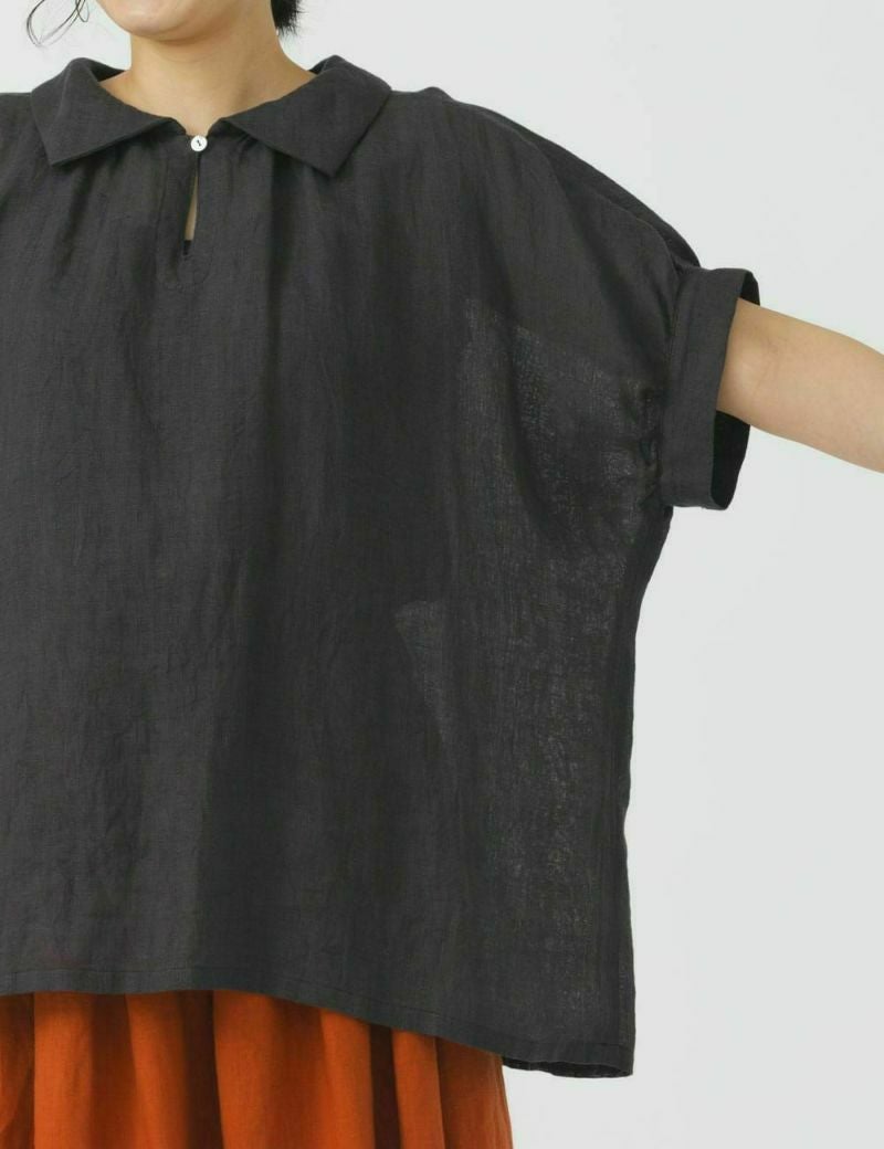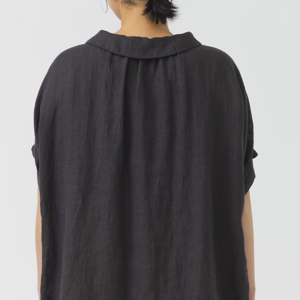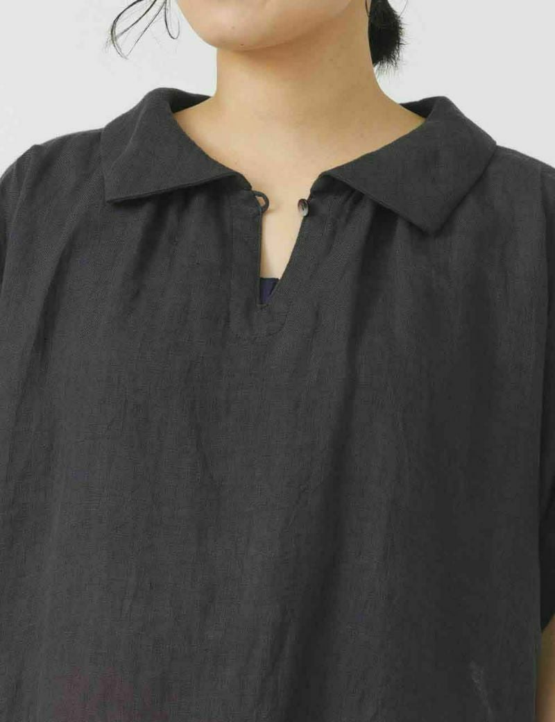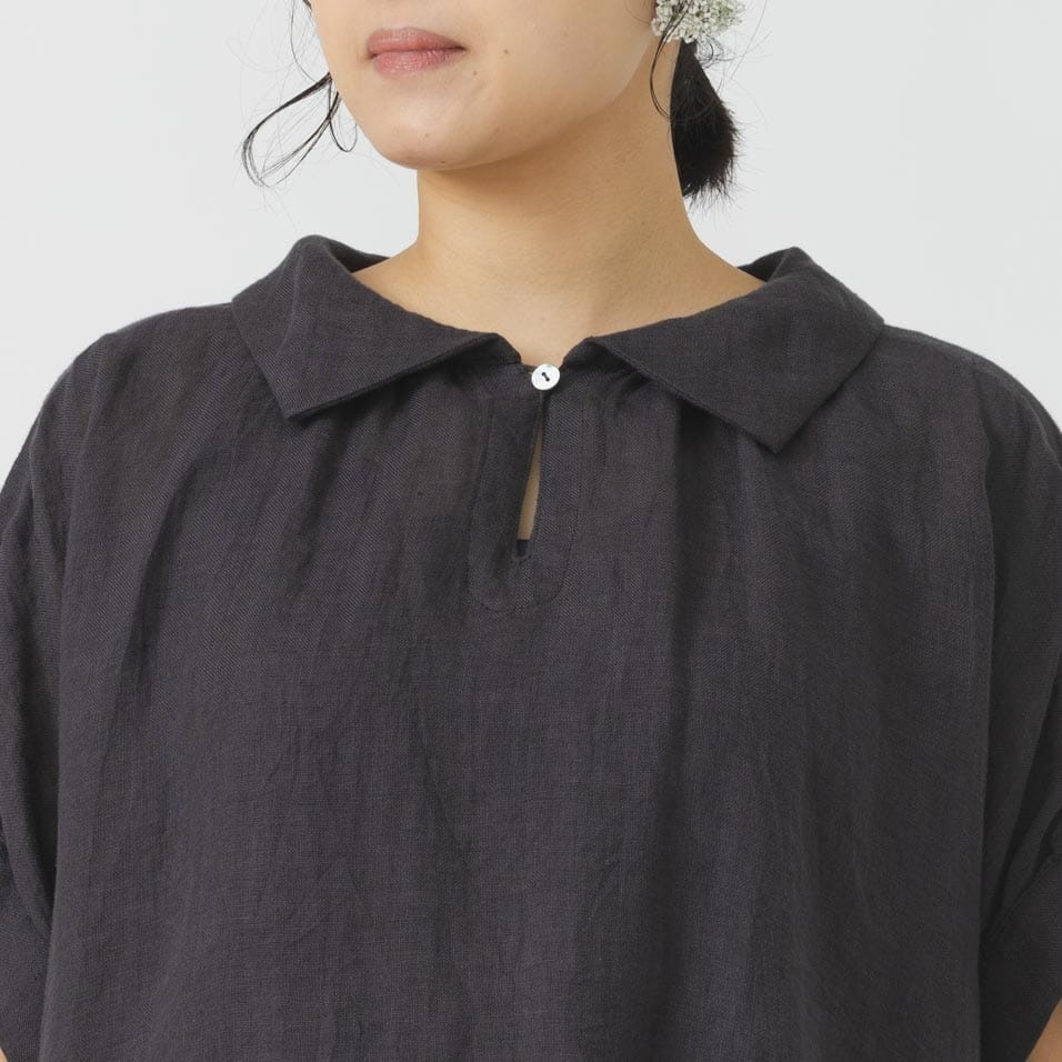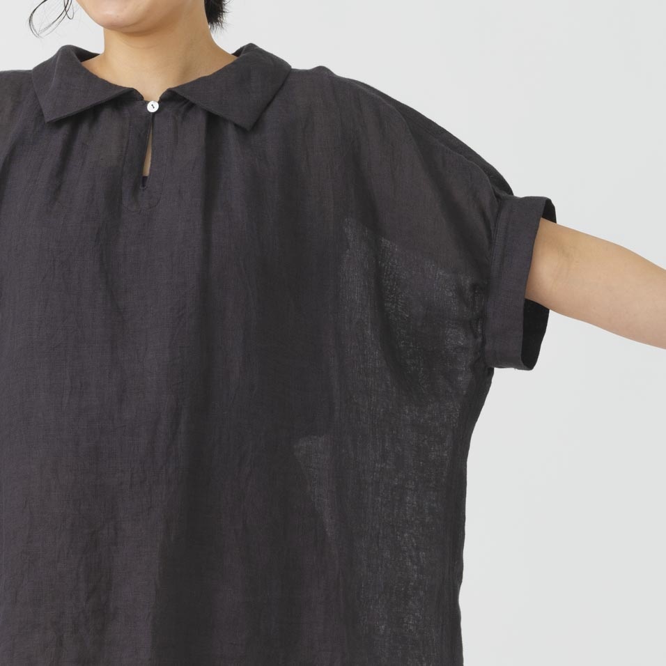 薄手の軽い素材で、ゆったりめのデザインが特長です。リネン特有のかたさがなく、しなやかに、快適に、夏を過ごせます。襟元のループボタンや、後ろ身頃のギャザーなど、ディティールに小技が効いています。