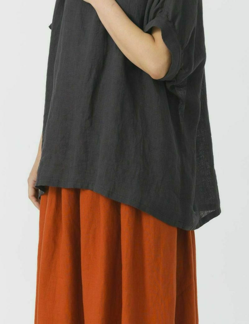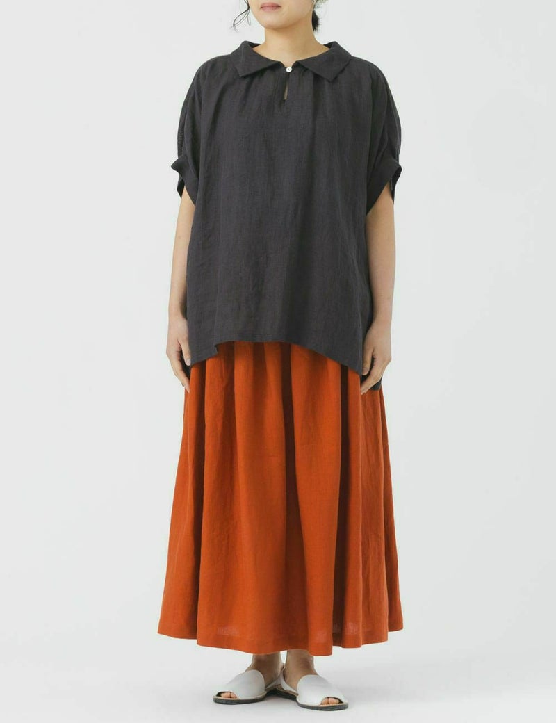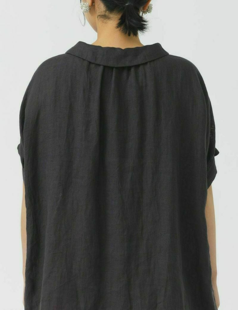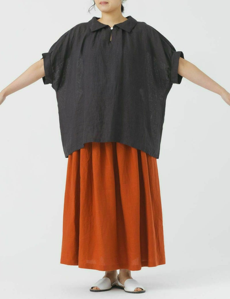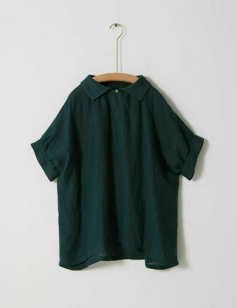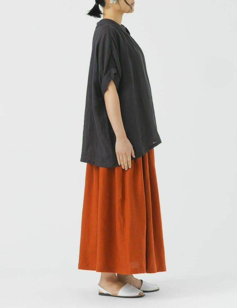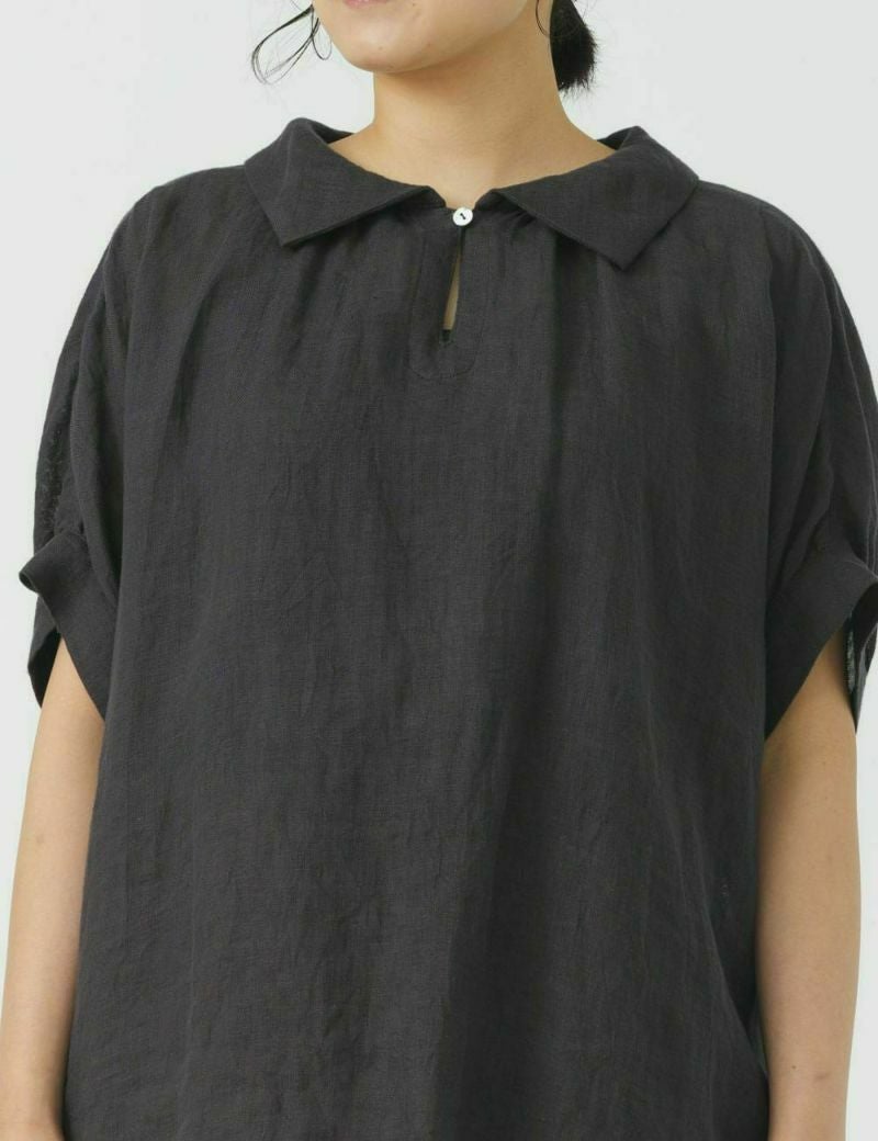 薄手の軽い素材で、ゆったりめのデザインが特長です。リネン特有のかたさがなく、しなやかに、快適に、夏を過ごせます。襟元のループボタンや、後ろ身頃のギャザーなど、ディティールに小技が効いています。