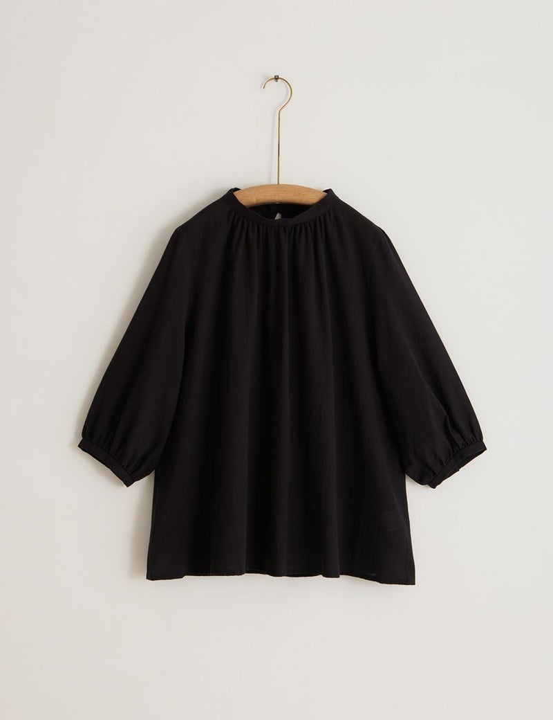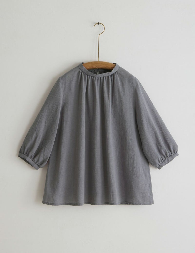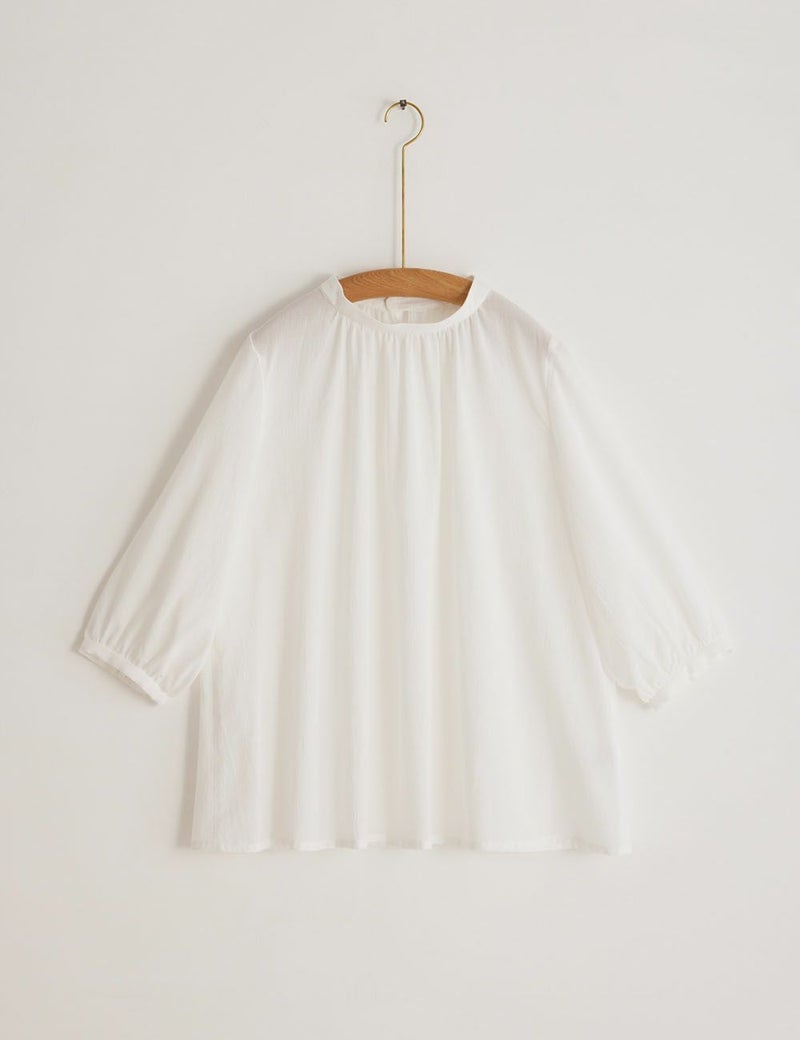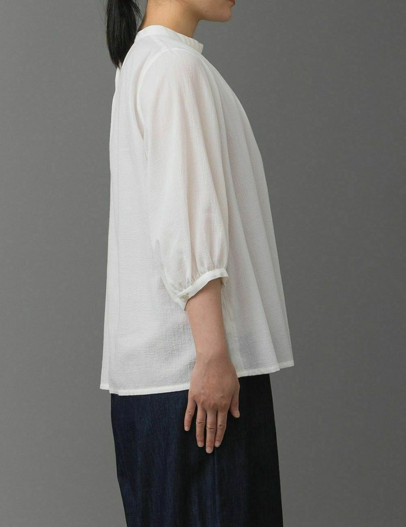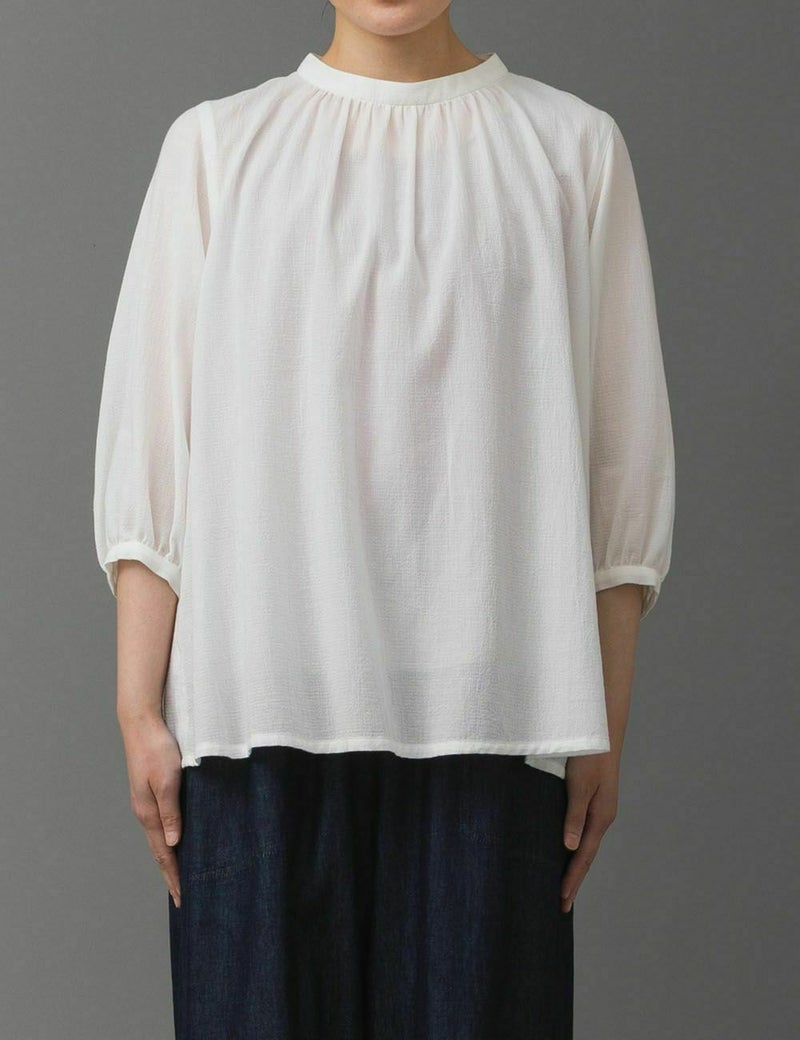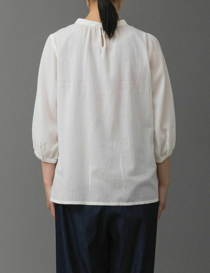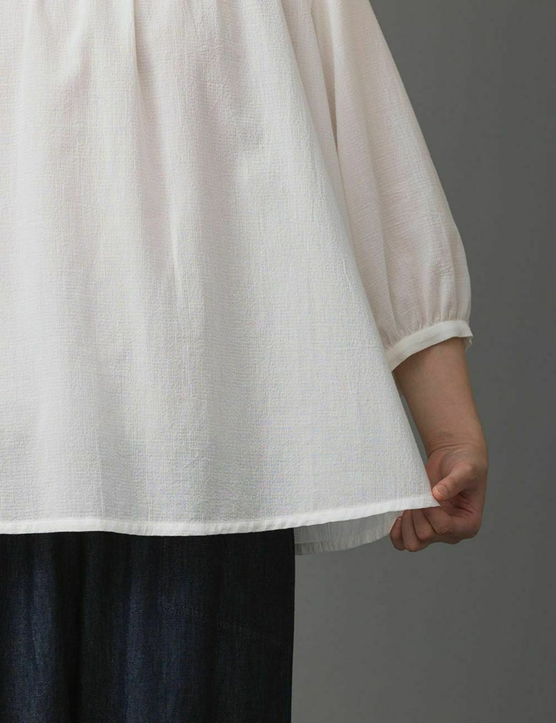 格子状の織柄をもつコットンでつくった群言堂定番のブラウス。ふんわりパフスリーブや襟元から広がるギャザーが、やさしい甘さを醸し出して、コーディネートに一枚投入するだけで、若々しい印象に。年間通して活躍シーンの多い一着です。