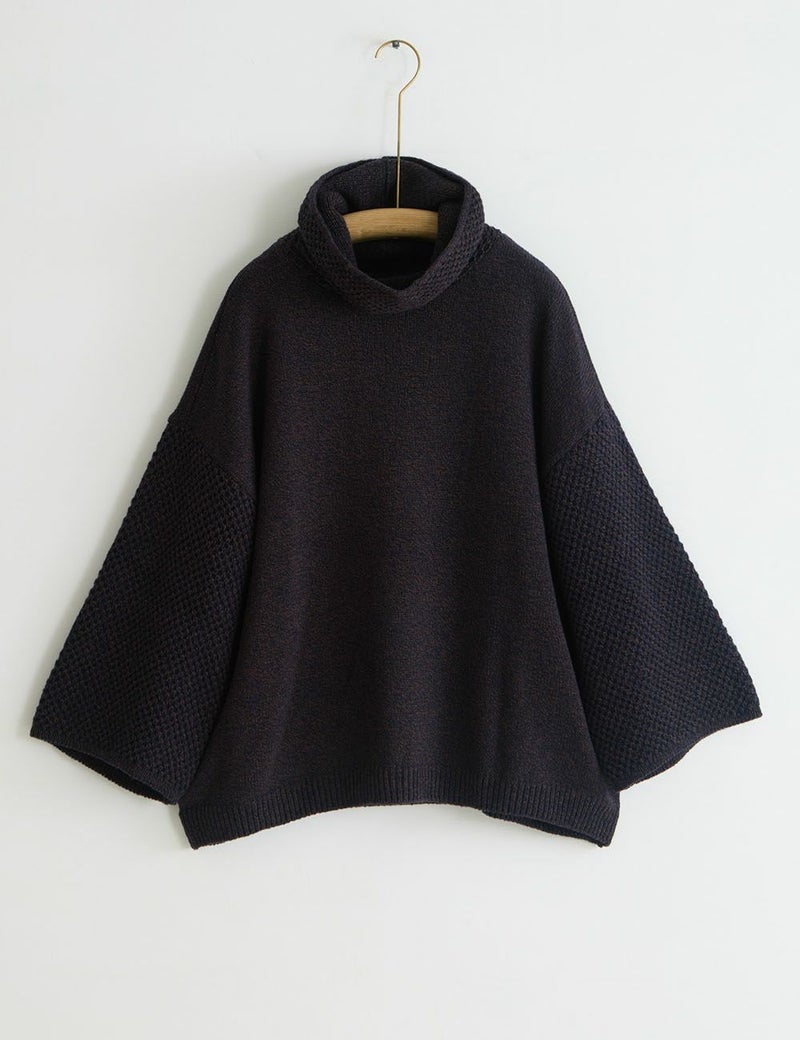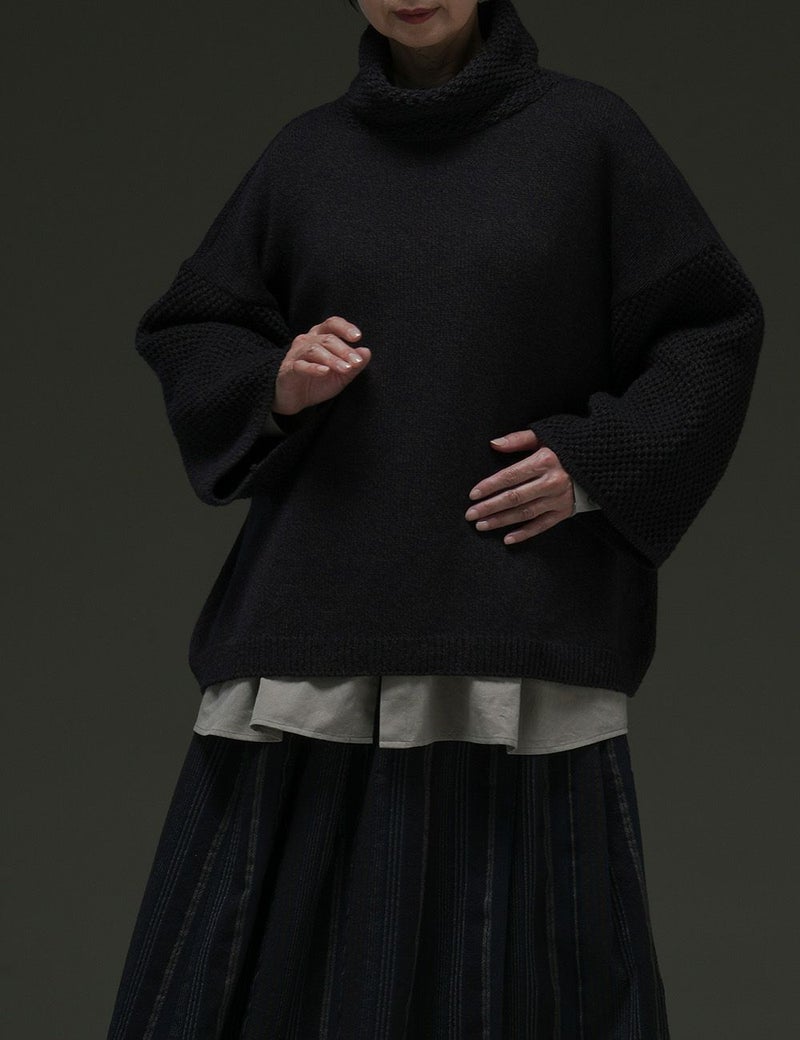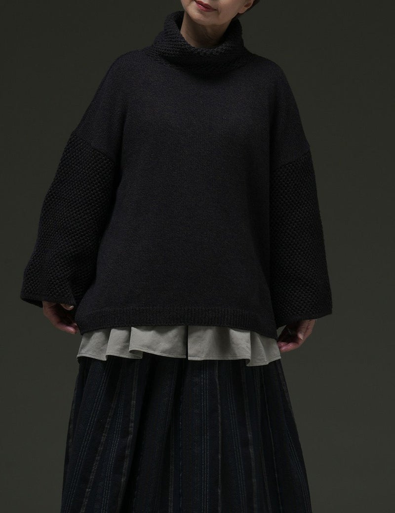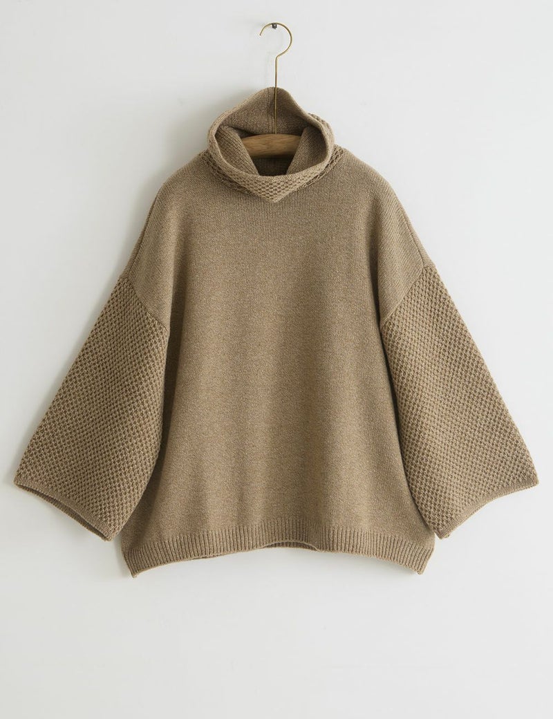 ウールと綿が混じり合った、杢調の色味を生かしたたっぷりサイズのニット。袖と首元にあしらった変わり編みの効果で、一枚さらりとまとうだけで存在感豊か。リラックスした雰囲気の中にも、芯のとおったおしゃれ心を感じさせます。