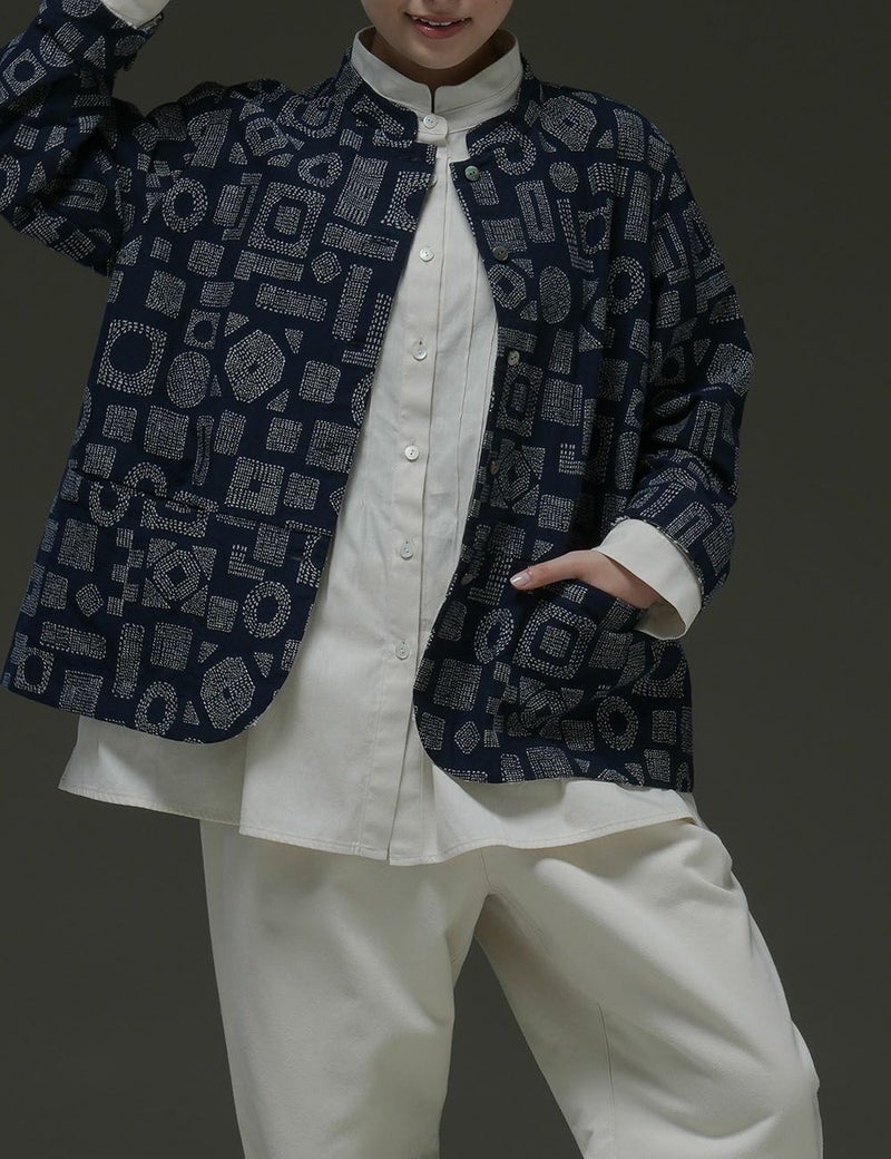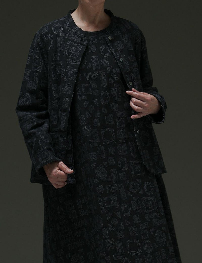 ハンドステッチで刺繍したような表情が印象的な、ジャガード織の羽織もの。装いに一枚投入するだけで、思わず視線を惹きつける新鮮なスタイリングが完成。軽いアウターとして着るのはもちろん、真冬はコートの中に着込んでもよく、長く重宝します。