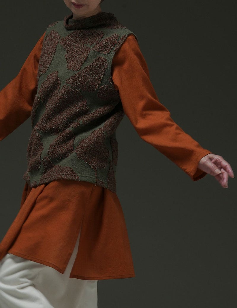 切り紙でつくったいちょうの葉を、パズルのように並べて作成した図案を、ニットジャガードで表現。ウールに綿の意匠糸2色を編み込み、湯洗いにかけることでウールを縮ませて、柄部分のカット糸の表情を豊かに浮き上がらせました。ソフトなふくらみのあるしなやかな風合いです。