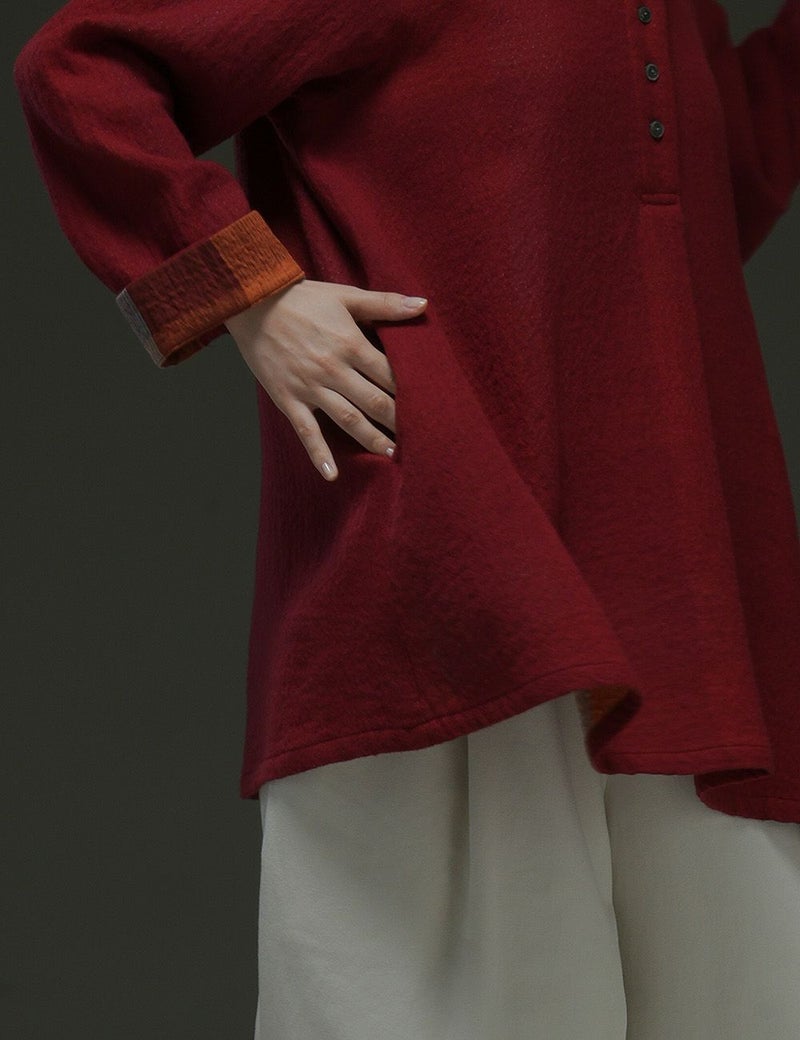 かろやかな綿ウール二重織で仕立てた、腰が隠れる丈のプルオーバー。肌面が綿素材なので、さらりと一枚で着ても快適に過ごせます。寒くなればタートルニットなどの上から重ね着もOK。短冊開きの若々しいスタイルで、活動的に過ごしたい日にぴったりです。