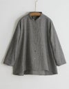 無地ライクな小さな千鳥格子が、どんなボトムスにもコーディネートしやすい前あきブラウス。マオカラー風の襟と、後ろ丈がやや長めになったシルエットは、羽織りものとして着ても絵になります。