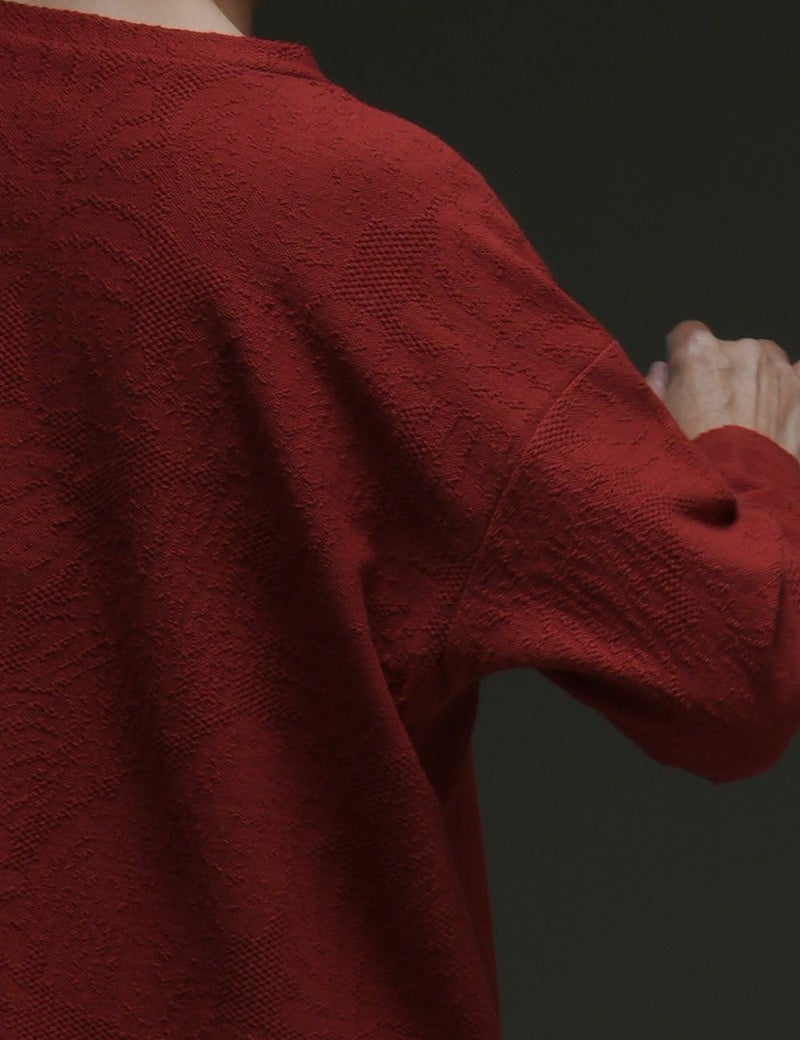 2本のコットン糸を撚り合わせた「双糸(そうし)」を用いて編み上げた上質なカットソー生地。肌面は、双糸らしいなめらかさを生かした風合いに仕上げている一方、表面は緯糸(よこいと)に別糸を編み込んで、糸玉イメージのモチーフを立体的に浮かび上がらせています。一色でも単調にならない、豊かな表情が魅力です。