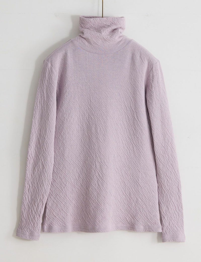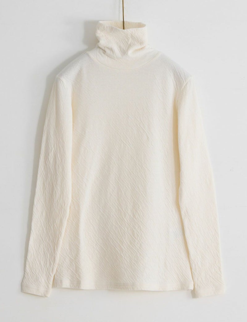 2枚の綿の生地のあいだに空気を含み、ふんわりとあたたかい、素肌にやさしい着心地になります。締めつけのないタートルネックで首回りもあたたか。裏表で色が違い、折り返すとアクセントに。色違いで揃えるのもおすすめです。
