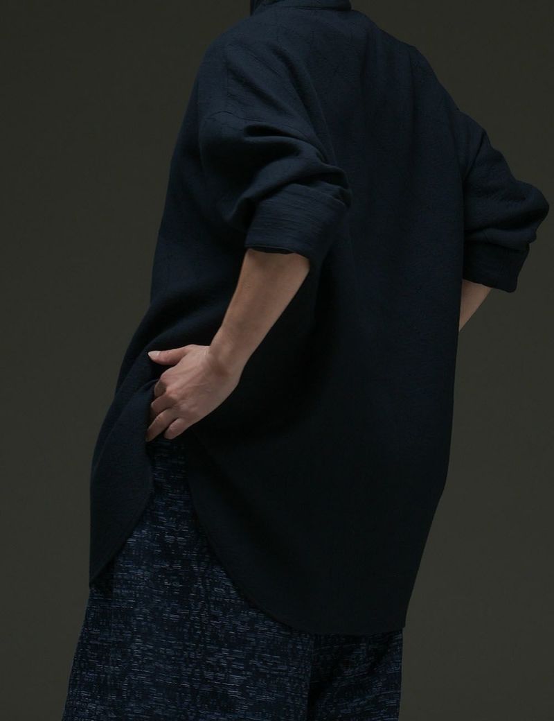 洗いざらした刺子のような表情を持つ風通織(二重織の一種)のチュニック。綿の素朴なぬくもりに満ちた着心地が味わえます。高さのあるショールカラーは、ボタンを留めればどこか東洋的な凛々しさを感じさせ、リラックスした中にも大人の洗練をプラス。