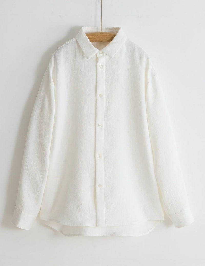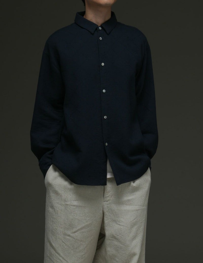 ランダムに刺子をほどこしたような表情が魅力のメンズ仕立てシャツ。M/Lの2サイズ展開で、男女問わず着用いただけます。綿の素朴なぬくもりに満ちた風通織(二重織の一種)は、さりげないシボ感も美しく、前を開けてふわりと羽織っても絵になります。