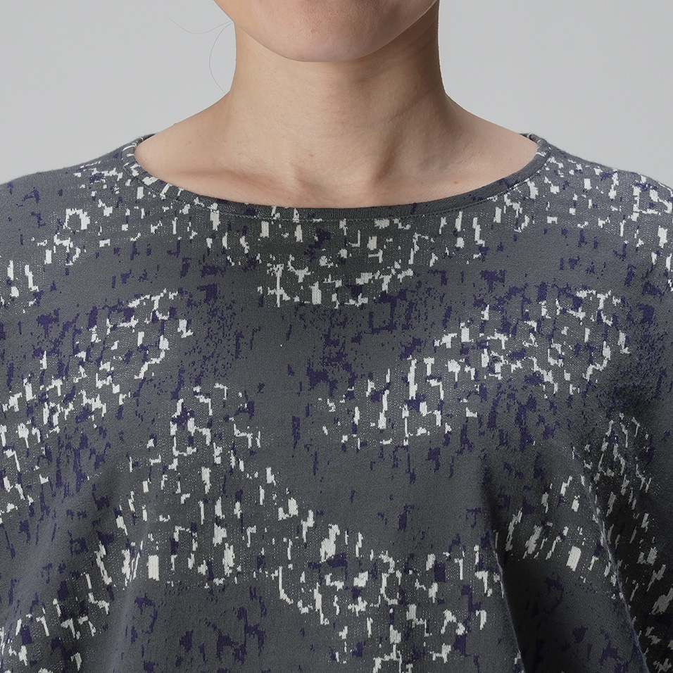 うねる波の中に見え隠れする海藻や小魚の姿をイメージしたジャガードニット。毛羽の少ないなめらかな糸を使用した地色に、2色の柄がからみあって、奥行きのある表情に。尾州ソトージェイテックさんの技術により、多色を使いながらも軽やかで繊細な質感に仕上がっています。